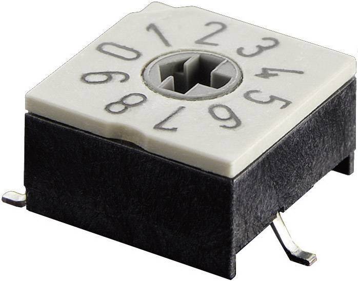 Dreh-Kodierschalter P60A im DIL-Raster. 4 + 1 Pins, mit Kreuzschlitz, präzisem Rastwerk, stabilen Anschlussstiften und gut ablesbaren Ziffern.