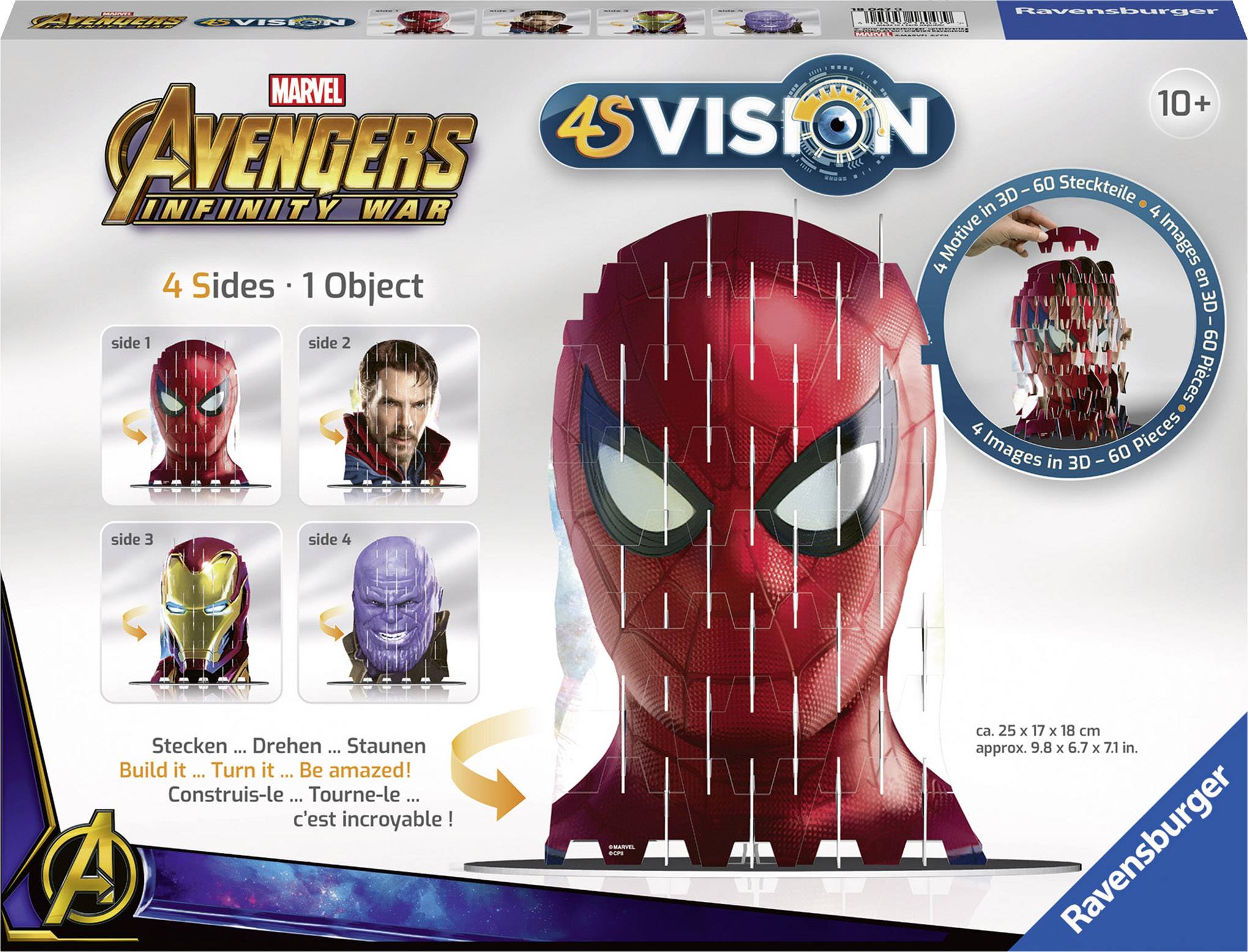 Jetzt das neue 4S Vision Steckspiel von Ravensburger entdecken! Die einzelnen Kartonteile lassen sich zu einem großen, faszinierenden 3D-Gesteck zusammenfügen. Hinter jedem Bauteil steckt eine eigene Geschichte. Durch das spannende Steck-Prinzip entstehen vier verschiedene Ansichten in einer dekorativen Figur. Wechselnde Blickwinkel sorgen so für wechselnde Motive.