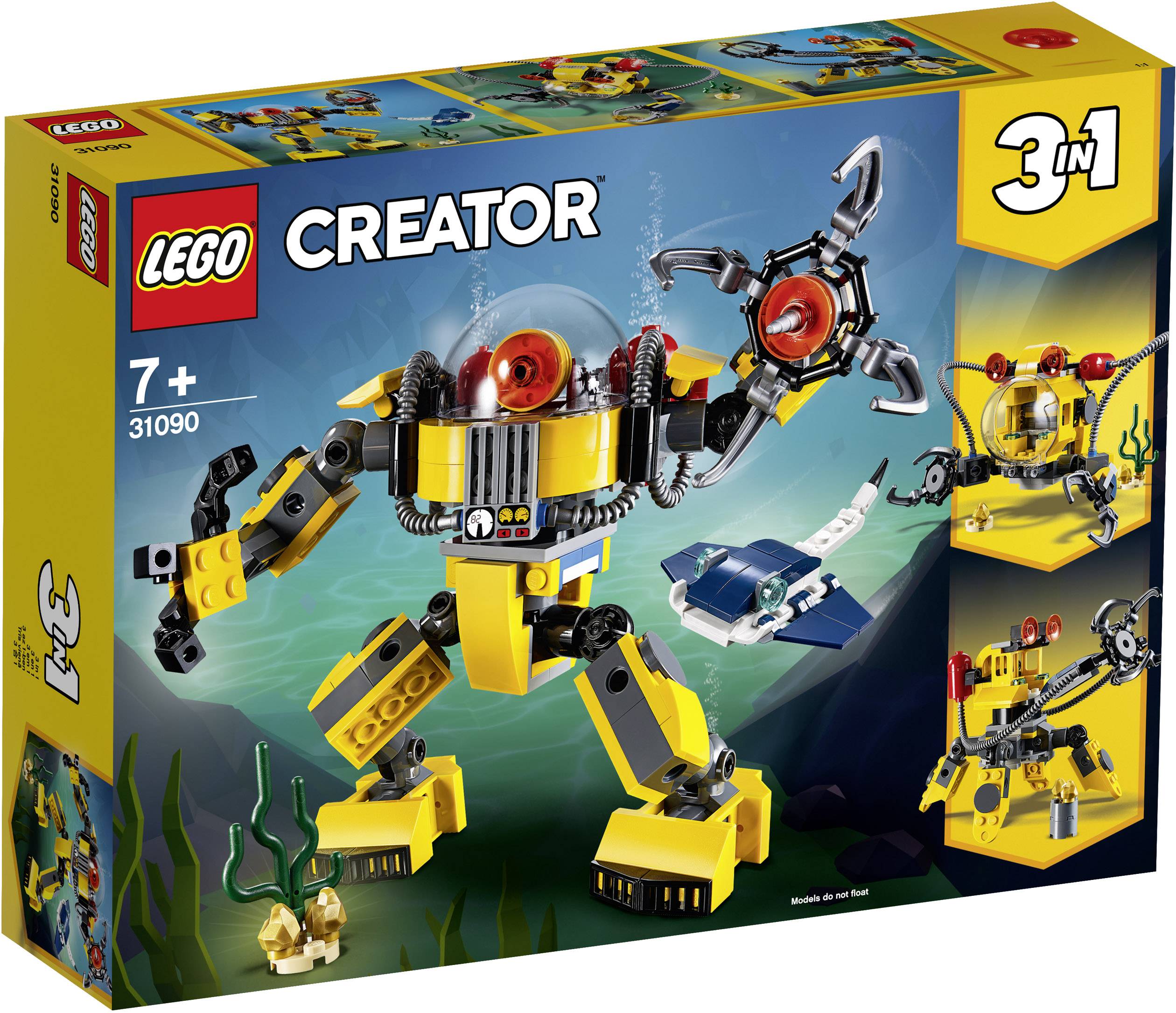 Erkunde die Tiefsee und begib dich auf die Suche nach versunkenen Schätzen – mit dem LEGO® Creator 3-in-1-Set „Unterwasser-Roboter“ (31090) mit äußerst beweglichen Gelenken, großem, transparentem, kuppelförmigem Helm, rotem Roboterauge, Ballasttanks und großen Füßen, um sich damit auf dem Meeresgrund fortzubewegen. Entferne das Roboterauge, um die Kuppel in ein Cockpit mit Kontrollzentrum zu verwandeln. Der Spielzeug-Unterwasser-Roboter verfügt außerdem über einen Greifer und einen Bohrer am Ende seines linken Arms und eine Klammer am rechten Arm. Als weiteres Zubehör enthält das Set einen Mantarochen und ein kleines Stück baubaren Meeresgrund mit Meerespflanze und Goldnugget-Elementen. Die LEGO Creator 3-in-1-Sets bieten dir drei verschiedene Bau- und Spielerlebnisse. Was möchtest du zuerst bauen: den Unterwasser-Roboter, ein Spielzeug-U-Boot oder – für eine tolle Suche nach versunkenen Schätzen – einen Unterwasser-Kran.