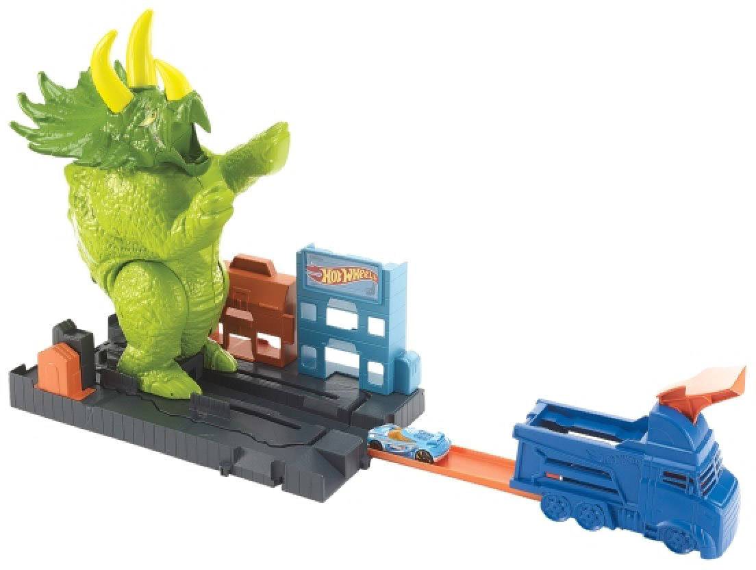 Ein gigantischer, wütender Triceratops greift Hot Wheels City an schaffen die Kinder es, die Stadt zu retten? Herausforderung angenommen! Einfach ein Auto in den Starter positionieren und es auf den Dino schleudern. Oh nein, der Triceratops wird noch wütender, bäumt sich auf und zerstört die Stadt! Ein weiteres Auto eilt zu Rettung, trifft ihn geschickt und der Dino ist besiegt. Mit diesem Hot Wheels Spielset sind der Fantasie keine Grenzen gesetzt. Hot Wheels City lässt sich individuell mit anderen City-Spielsets kombinieren. Die City- Spielsets sind außerdem kompatibel mit orangenen Tracks und weiteren Spielsets. Enthält einen Starter und ein Hot-Wheels-Fahrzeug.