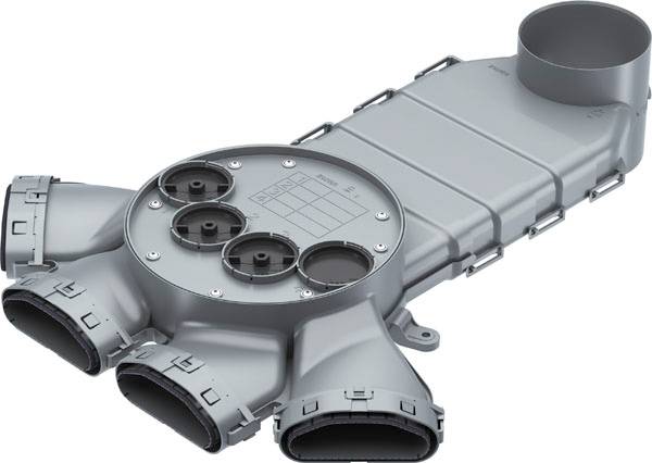Luftverteiler mit 4 Anschlussmöglichkeiten für den flexiblen Luftkanal und einem Hauptanschluss. Der Luftverteiler besteht aus korrosionsbeständigem, geruchsneutralem Kunststoff. Inkl. abnehmbarem Revisionsdeckel mit Einstellmöglichkeiten.