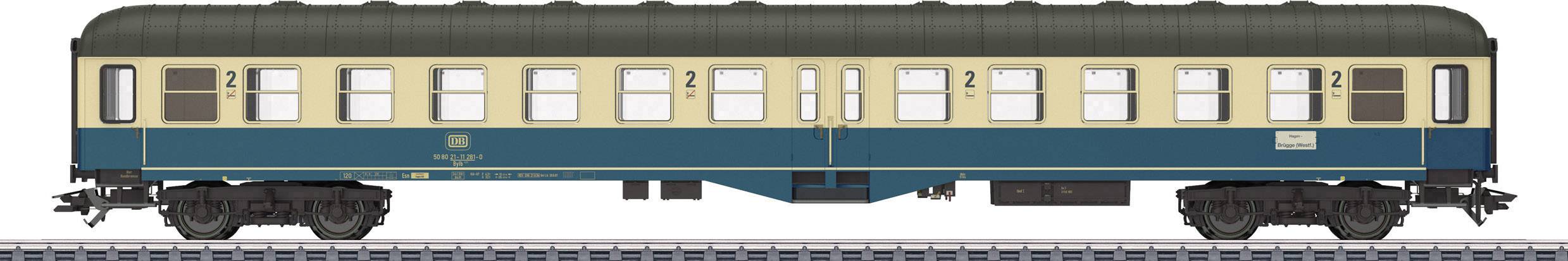 Serienmäßig eingebaute LED-Innenbeleuchtung und Strom führende Kupplungen. Die Innenbeleuchtung funktioniert nur im Verbund mit dem Mitteleinstiegs-Steuerwagen und kann über einen Decoder im Steuerwagen digital ein- und ausgeschaltet werden. Stirnseitig rot transparente Schlusslicht-Einsätze an den Wagenenden. Typspezifisch gestalteter Unterboden. Drehgestelle Bauart Minden-Deutz schwer mit Doppelklotzbremse und Generator D 62s. Befahrbarer Mindestradius 360 mm. Für die Präsentation in einer Vitrine liegen WC-Fallrohre und Wendezugsteuerleitungen als separat ansteckbare Teile bei. Länge über Puffer 28,2 cm