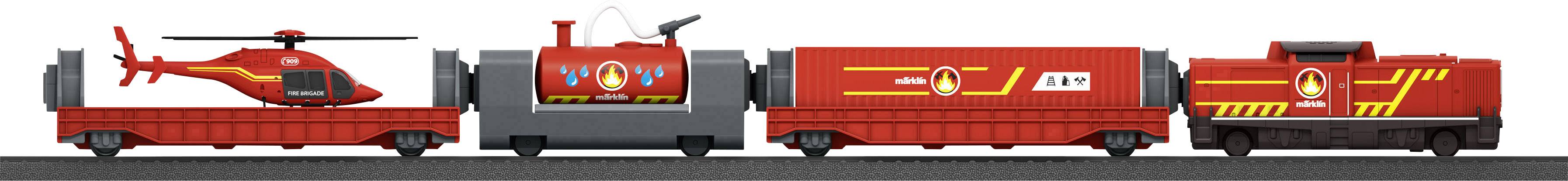 Lokomotive mit Akkuantrieb und Magnetkupplung am hinteren Fahrzeugende. Motor, Akku und die gesamte Elektronik sind für Kinder unzugänglich verbaut. Die Lok kann mit dem mitgelieferten Ladekabel aufgeladen werden. Jeweils 3 Geschwindigkeitsstufen bei Vorwärts- und Rückwärtsfahrt, sowie 3 Soundfunktionen und ein Dreilicht-Spitzensignal, sind über den kindgerechten Märklin Power Control Stick steuerbar. Containertragwagen mit einem kindgerechten, stabilen Container, der geöffnet und beladen werden kann. Ein fest verbautes Metallteil im Container ermöglicht die magnetische Verladung, bei der gemeinsamen Nutzung mit dem Güterverladebahnhof 72211. Kesselwagen mit manueller Wasserspritze. In den Wassertank kann Wasser eingefüllt und über die manuelle Wasserspritzfunktion bedient werden. Tragwagen inklusive Hubschrauber als Beladung. Hubschrauber mit manuell bedienbaren Rotationsblättern. Güterwagen mit kindgerechten Magnetkupplungen. Länge des Zuges 59 cm. Inhalt: 12 gebogene Kunststoffgleise, 7 gerade Kunststoffgleise (172 mm), 5 gerade Kunststoffgleise (188 mm), 2 gebogene Kunststoffgleise (Weichenbogen), 1 Weiche links, 1 Weiche rechts und ein kabelloser, handlicher Märklin Power Control Stick. Ein USB-Ladekabel für die Lokomotive und 2x AAA Batterien sind im Lieferumfang enthalten. Der Zug kann mit zwei verschiedenen Frequenzen betrieben werden und kann somit mit einem weiteren akkubetriebenen Zug ergänzt werden. Erweiterbar mit der Kunststoffgleis-Ergänzungspackung 23300.