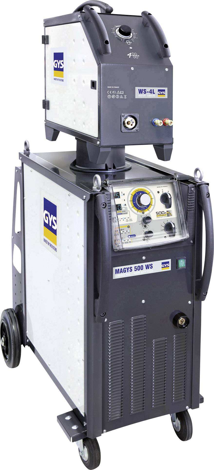 Die Schweißstromquelle MAGYS 500 WS wird in Kombination mit dem Drahtvorschubgerät WS-4L (optional) zu einer dreiphasigen, wassergekühlten und halbsynergischen Schweißanlage mit hoher Einschaltdauer. Sie eignet sich ideal für Stahl, Edelstahl und Aluminium verarbeitende Industriewerkstätten. Ausgerüstet mit einem 5 oder 10 Meter langem 95 mm² -Zwischenschlauchpaket eignet sie sich besonders für intensive Schweißarbeiten bis 1,6 mm Drahtstärke.