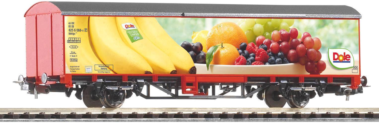 Druckvariante des Ged. Güterwagens mit attraktiver Werbung für Dole in der Ausführung der DB AG in der Ep. VI.