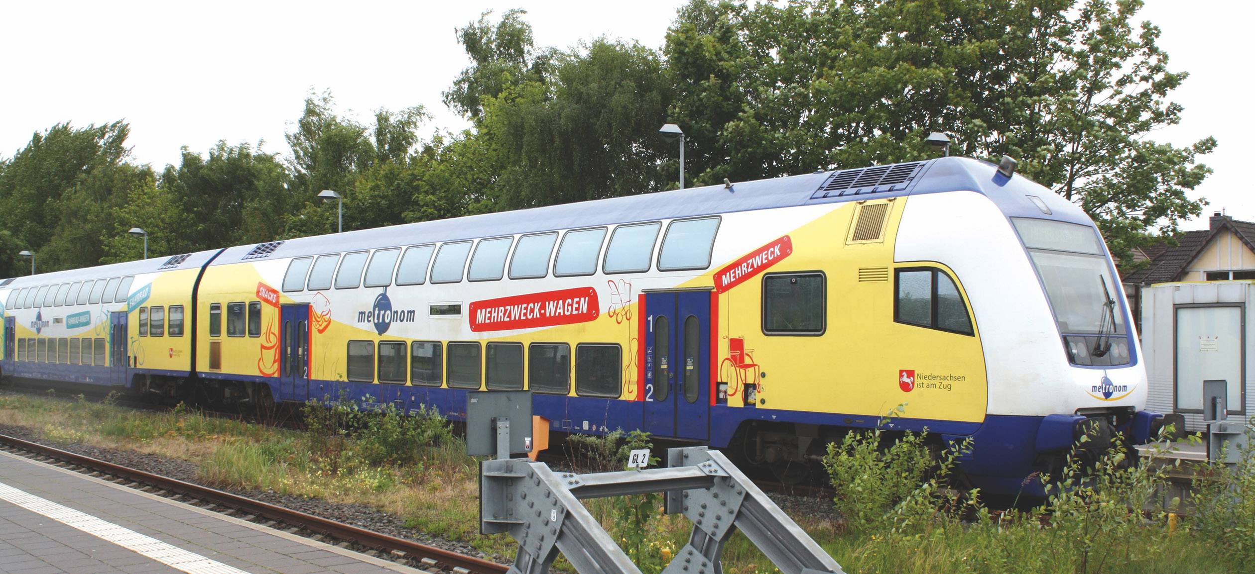 Druckvarianten von zwei Doppelstockwagen mit Doppelstocksteuerwagen in der Ausführung metronom in der Epoche VI. 3er Set.