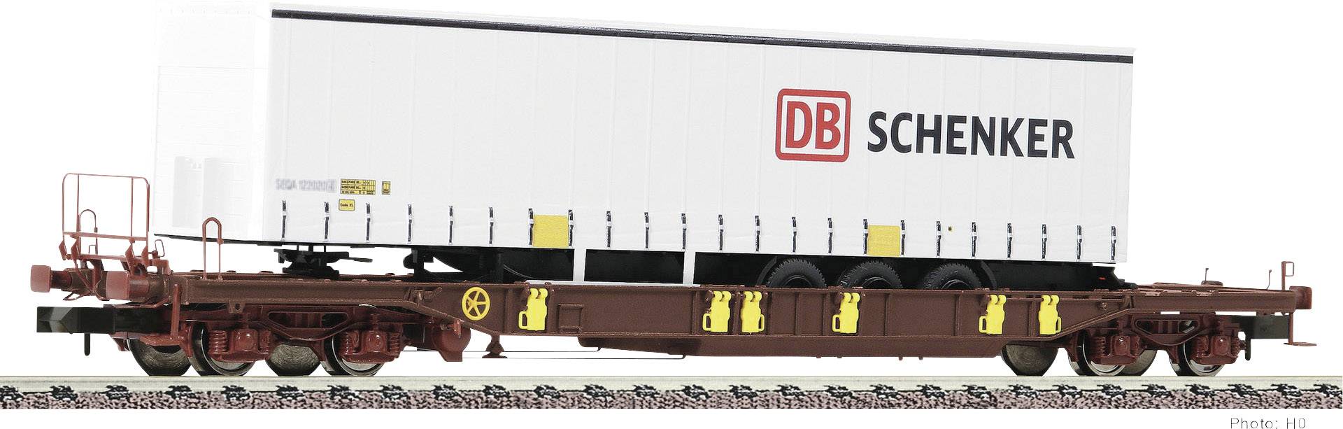 Taschenwagen Bauart Sdgmns 33, der Ahaus Alstätter Eisenbahn beladen mit einem Auflieger der Spedition „DB Schenker“, Epoche VI.