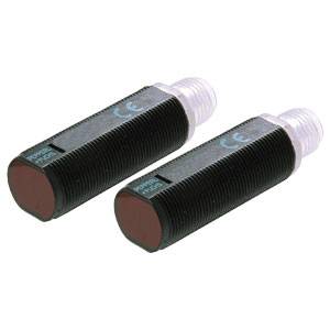 Einweg-Lichtschranke, Gewindebauform M18, Kunststoffgehäuse, Lichtaustritt frontal, Reichweite 20 m, Rotlicht, Hellschaltung, AC/DC-Version, NPN-FET-Ausgang, Micro-Stecker