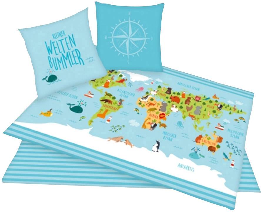 Hochwertige Bettwäsche mit schönem Weltkarten-Motiv. Bestehend aus Bettbezug mit Marken-RV in der Größe 135x200cm und einem Wendekopfkissen mit Marken-RV in der Größe 80x80cm.