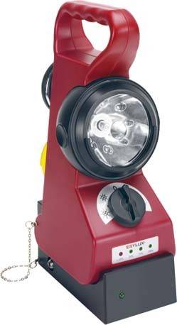 Transportable Notleuchte mit Bereitschaftsschaltung. Separater Wand-/Bodenhalter als Ladeteil mit externem Steckernetzteil 230 V/50 Hz plus separatem Kabel für Spannungsversorgung 12 - 48 V DC, z. B. aus einem Fahrzeug. Hauptlicht Halogen, Dauer- oder Blinklicht. Sekundärlicht 8 LEDs, Dauer- oder Blinklicht. Per frontseitigem Schalter wählbar. Kapazitätsanzeige des wartungsfreien Akkus. Ladeanzeige durch LED. Kugelkopf horizontal und vertikal schwenkbar. Rückseitiger Magnet um die Notleuchte auf Eisen- oder Stahlflächen zu befestigen. Inklusive farbiger Vorsatzscheibe gelb. Halter für 4 Vorsatzscheiben auf der Rückseite. Splint und Kette zur Arretierung der Notleuchte am Wand-/Bodenhalter.