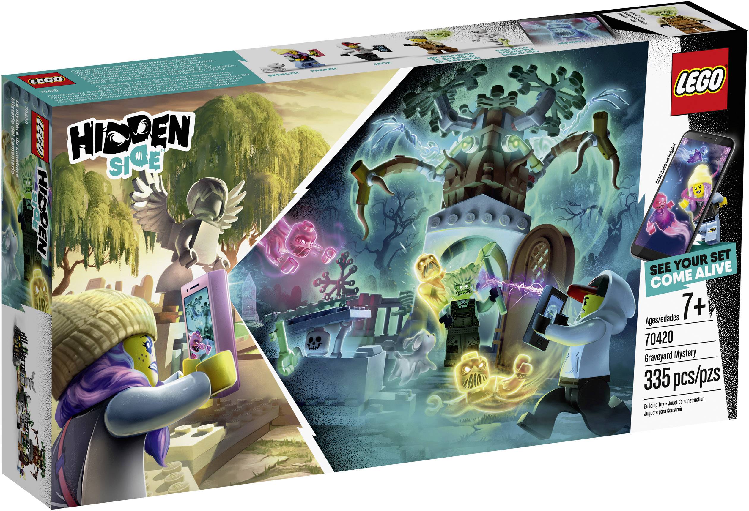 Kinder können mit dem tollen Spielset „Geheimnisvoller Friedhof“ (70420) spannende Geisterjäger-Abenteuer in Kombination mit Augmented Reality erleben! Dieses großartige Spielset mit App für Kinder kombiniert ein baubares LEGO Modell mit Augmented Reality und sorgt so für ein vollständig interaktives Spielerlebnis. Lade dir die Hidden Side App herunter und scanne das Modell mit deinem Smartphone, um es zum Leben zu erwecken. Kontinuierliche Aktualisierungen, für jedes Set einen einzigarten Geisterboss, der überwunden werden muss, immer neue Rätsel, Gegenstände und Geister, die gesammelt werden müssen – das LEGO Hidden Side Set schafft für Kinder beim Spielen mit LEGO Steinen völlig neue Möglichkeiten! Das Konstruktionsspielzeug steckt voller cooler Friedhof-Details. Es umfasst eine Hunde-Figur, eine Gärtner-Figur, jeweils eine Mädchen- und Jungen-Minifigur, eine drehbare Statue, ein Grab mit Funktion zum Öffnen und einen verfluchten Baum mit beweglichen Ast-Armen für tolle Geisterjagd-Abenteuer.