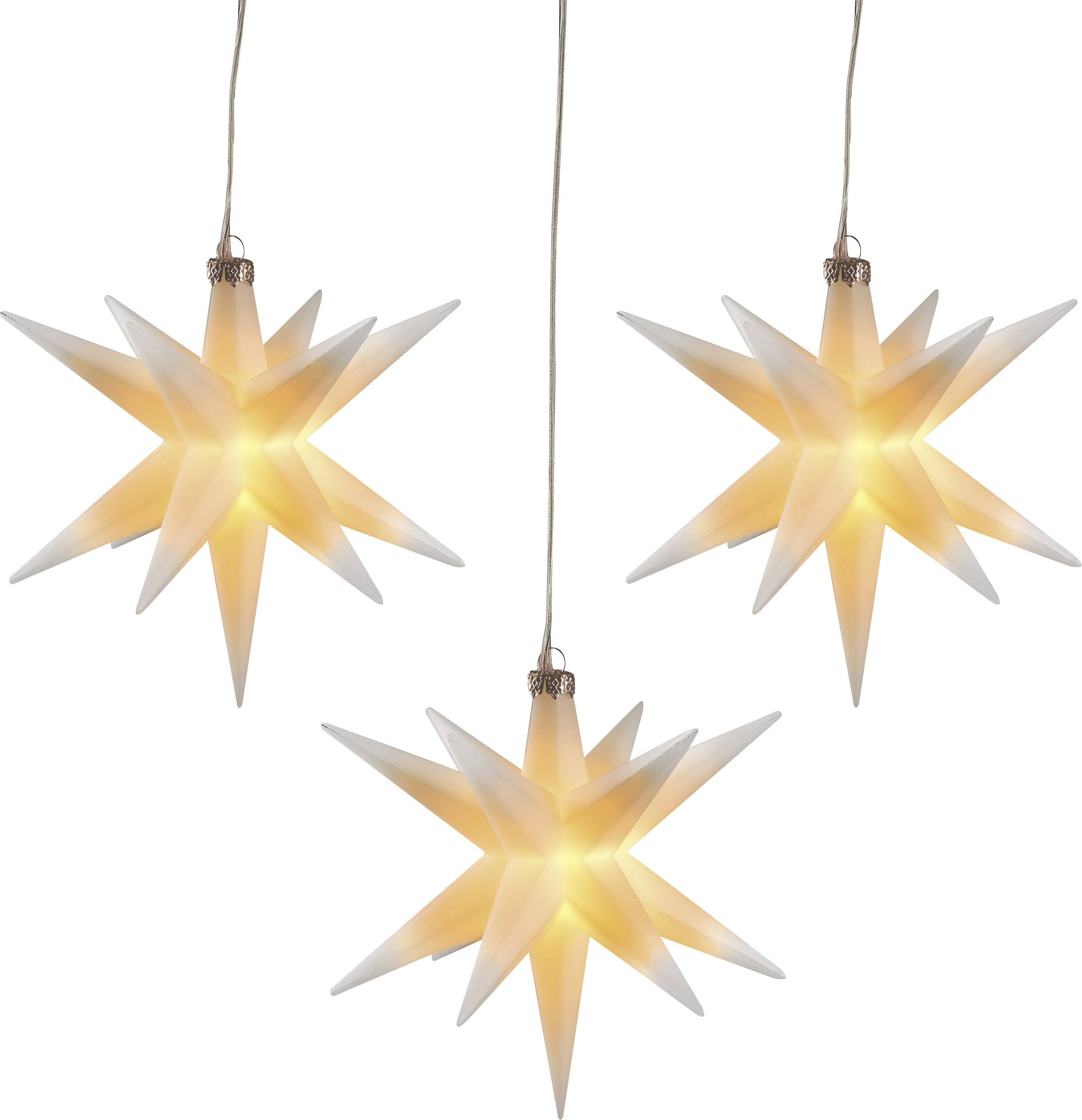 Mit strahlendem Weiß kommt man den Sternen besonders nah. Diese hochwertige Lichterkette mit drei 14 zackigen Sternen aus Kunststoff leuchtet warm/weiß. Die austauschbare LED-Elektrik ist im Lieferumfang enthalten, energiesparend und langlebig. Mit 5 Metern Kabellänge bis zur Steckdose haben Sie genügend Spielraum, die Girlande dort aufzuhängen, wo es Ihnen beliebt – im Erker, im Schaufenster oder sogar am Weihnachtsbaum. Da LED-Lampen keine Wärme erzeugen, brauchen Sie sich bei der Wahl des Standortes keine Gedanken machen. Sie können die Sternenkette auch für den Außenbereich verwenden. Warum nicht unterm Regenvordach oder Carport? Die einzelnen Sterne haben einen Durchmesser von 12 Zentimetern.