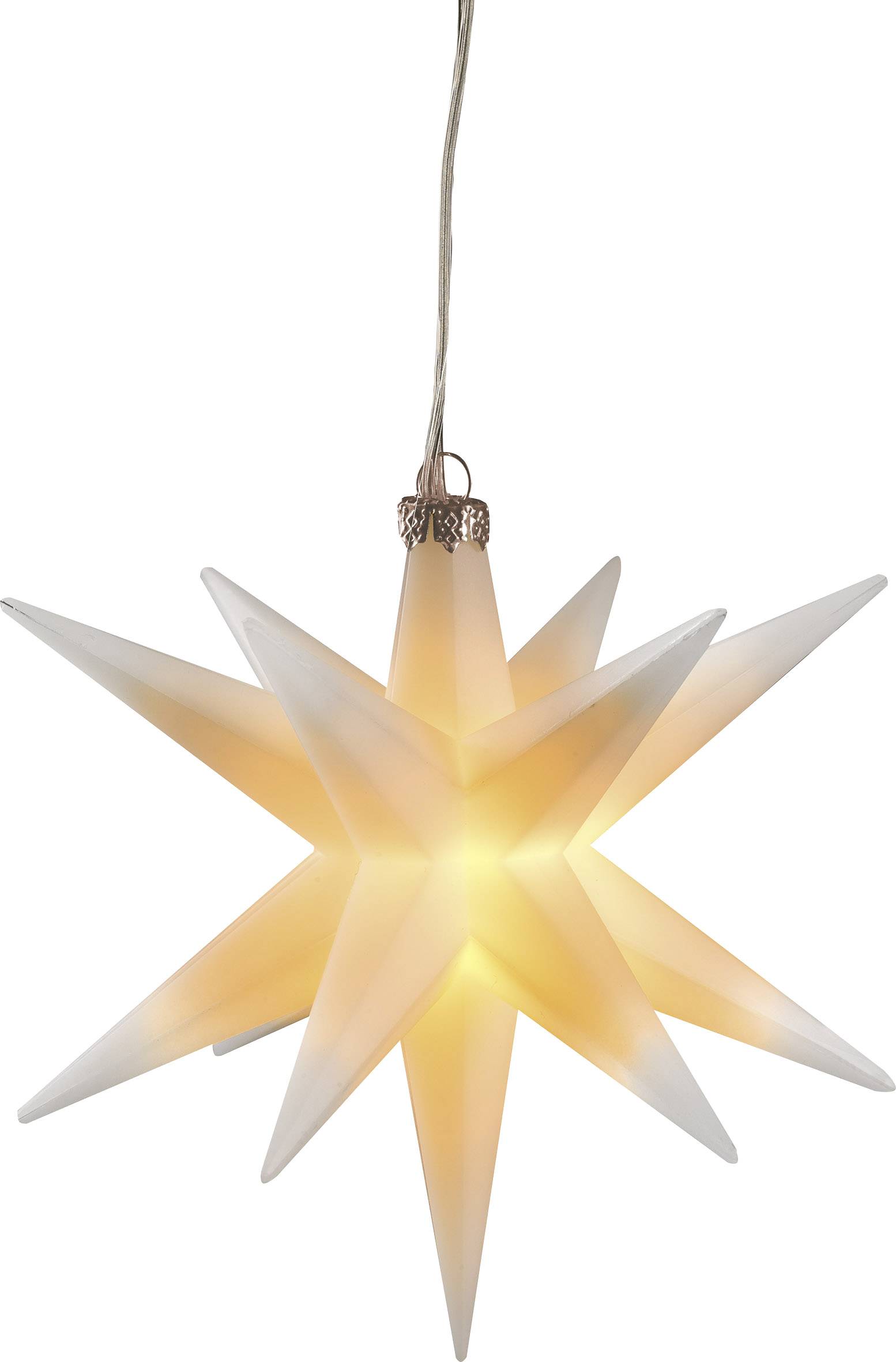 Holen Sie sich das Sternenlicht ins Fenster! Dieser kleine weiße Weihnachtsstern mit 14 Zacken leuchtet zur Advents- und Weihnachtszeit, und wenn Sie mögen darüber hinaus, in warm-weißem Licht. Mit einem Durchmesser von 12 Zentimetern passt er in jedes noch so kleine Fenster oder als Deckendeko ins Wohnzimmer. Kombinieren Sie doch einfach mehrere kleine Kunststoffsterne, am besten in verschiedenen Farben (weitere Farben und Formen im Shop). Der Kunststoffstern wird mit zwei AA Batterien, die nicht im Lieferumfang enthalten sind, betrieben. Die Timerfunktion regelt den An- und Ausbetrieb. Die Kabellänge bis zum Batteriefach beträgt 50 Zentimeter. Eine praktische Aufhängung ist anbei. Den Stern bitte nicht außen verwenden! Er ist nicht wetterfest.