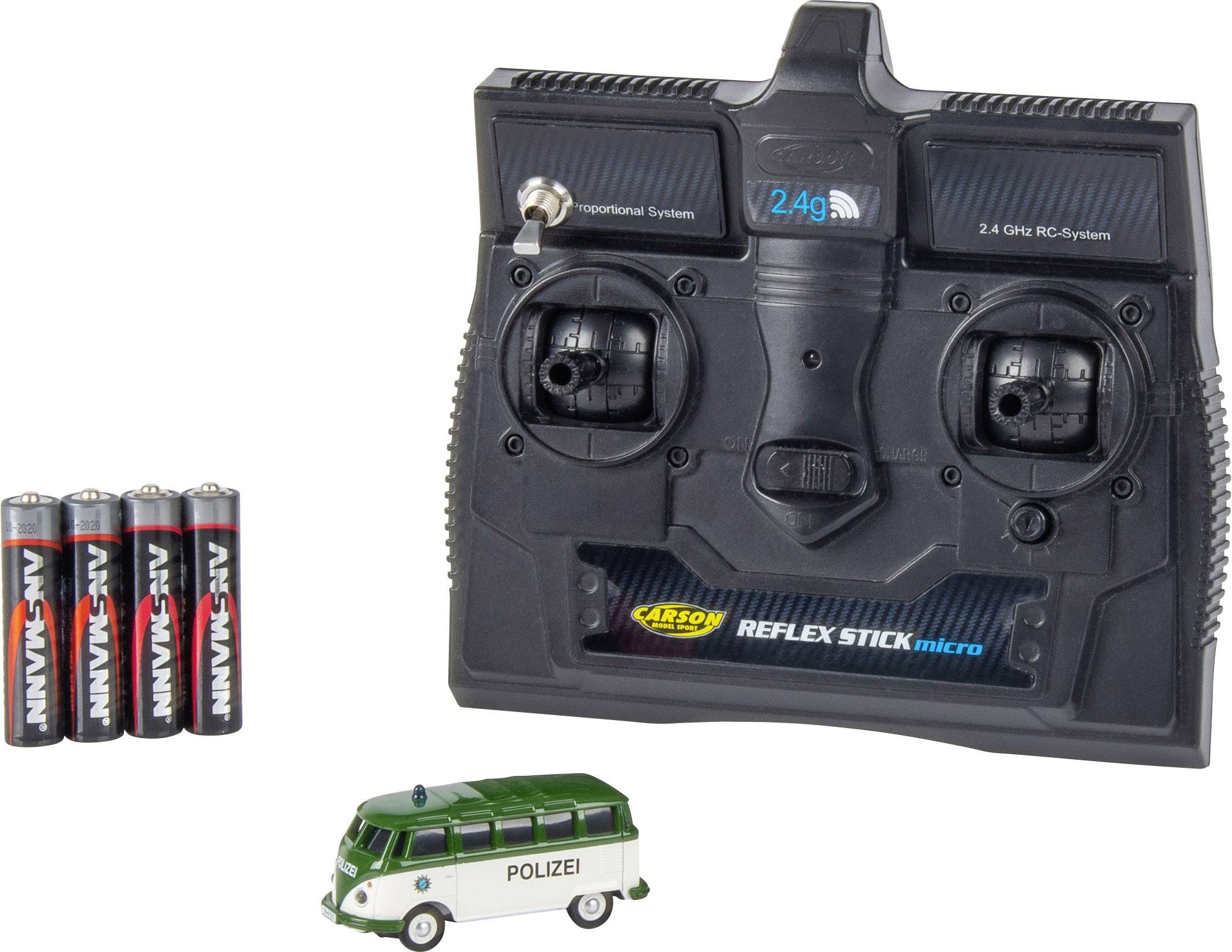 High-Tech im Kleinstformat. Die Entwickler von CARSON haben all Ihre Erfahrung in die Entwicklung der neuen VW T1 Polizei einfließen lassen. So verfügt das Einsatzfahrzeug im Maßstab 1:87 über eine störungsfreie 2,4 GHz Fernsteueranlage, die eine fein abgestimmte Steuerung (digital-proportional) von Gas und Lenkung mit Lenkungstrimmung zulässt. Der eingebaute Li-Ion Fahrakku ermöglicht eine Fahrzeit von bis zu 35 Minuten bei nur 30 Minuten Ladezeit und wird über den Power-Plug direkt am Sender geladen. Damit ist der kleine VW auch unterwegs immer fahrbereit. Durch seinen sehr kleinen Wendekreis fühlt sich der Nostalgiker alternativ zum Schreibtisch auch auf einer Eisenbahnanlage wohl und bringt somit auch neben den Gleisen Bewegung auf die Straße. Die detaillierte Lackierung und Bedruckung sowie funktionierende Fahr- und Rückleuchten und das über den Sender steuerbare Blaulicht mit Martinshorn runden den starken Auftritt des kleinen Klassikers ab und die technisch designte Fernsteuerung „Reflex Stick Micro" bildet perfekt das Bindeglied zwischen Nostalgie und Moderne.