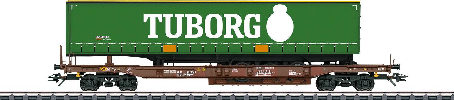 KLV-Taschenwagen der AAE. Rahmen, Boden und Lademulden aus Metall. Spezial-Drehgestelle in niedriger Bauweise. Viele angesetzte Details. Rechteckpuffer. Ladehalterungen verstellbar. Der Wagen ist mit einem Gardinenplane-Sattelauflieger der Brauerei Tuborg beladen. Gleichstromradsatz E320577.