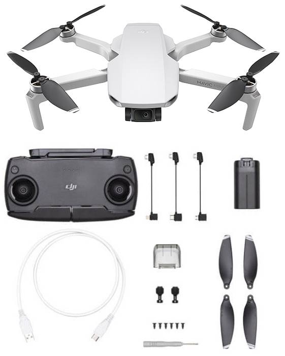 Drohne mit Kamera + Fernsteuerung + 1 LiIon Flugakku + Gimbal-Schutz + Ersatzpropeller (Paar) + Micro-USB-Kabel + RC-Kabel (Micro-USB) + RC-Kabel (USB-C) + RC-Kabel (Lightning) + Zusätzliche Steuerknüppel (Paar) + Schraubendreher + Ersatzschraube (6x) + Anleitung.