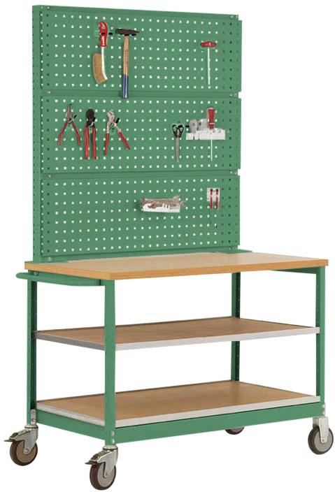 Mobile Werkbank Modell 3 - mobil und stabil in einem. Die mobile Werkbank bietet Ihnen nicht nur einen fahrbaren Arbeitsplatz, sondern zugleich dient er Ihnen auch als einfacher Transportwagen. Die Werkbank ist in Resedagrün RAL 6011 hochwertig pulverbeschichtet. Sie ist 780 mm hoch, 1135 mm breit und hat eine Tiefe von 590 mm plus Abdeckplatte. Die mobile Werkbank ist mit zwei durchgehenden Holzverbund-Einlegeböden ausgestattet, die einen 5 mm hohen Abrollrand besitzen. Die Einlegeböden sind im Raster von 50 mm höheneinstellbar. Darüber hinaus verfügt die mobile Werkbank über ein Stahl-Aufbauportal, Lochplatten befestigt sind. Somit können Sie ihre Werkzeuge und Montagematerialien optimal am Arbeitsplatz unterbringen. Der Grundrahmen des Wagens ist äußerst robust und mit einem handlichen Schiebebügel ausgestattet, wodurch die Lenkung der mobilen Werkbank vereinfacht wird. Auf dem Grundrahmen wird die geölte Multiplex-Abdeckplatte befestigt die 30 mm stark ist, mit einer Breite von 1080 mm und einer Tiefe von 600 mm. Die Platte besteht entsprechend der DIN 68705 Teil 2 aus einer Buche-Vielschichtplatte der Güteklasse I/III. Die Multiplex-Tischplatte ist unter hohem Druck kreuzweise wasserfest verleimt nach DIN 68705 IF (IW67) sowie umweltschonend geölt. Alle Kanten und Ecken sind geschliffen und gefast. Eine Klarlackierung der Multiplexplatte ist auf Anfrage möglich. Die Multiplex-Tischplatte wird überall da eingesetzt, wo hohe mechanische Beanspruchungen, wie im Montage- und Fertigungsbereich, gefragt sind. Aufgrund der Verleimung kann die Tischplatte auch für gelegentliche Arbeiten mit feuchten Materialien eingesetzt werden. In der Lieferung sind 2 Lenkrollen und 2 Bockrollen enthalten, zu Ihrer Sicherheit sind die Lenkrollen mit Feststeller ausgestattet. Gegen Aufpreis können Sie auch 4 Lenkrollen davon 2 mit Radfeststellern bestellen (Bestell-Nr.: TV0306). Die mobile Werkbank hat eine Gesamtbreite von 1135 mm, eine Tiefe von 590 mm und eine Höhe von 810 mm.