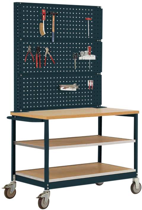 Mobile Werkbank Modell 3 - mobil und stabil in einem. Die mobile Werkbank bietet Ihnen nicht nur einen fahrbaren Arbeitsplatz, sondern zugleich dient er Ihnen auch als einfacher Transportwagen. Die Werkbank ist in Anthrazit RAL 7016 hochwertig pulverbeschichtet. Sie ist 780 mm hoch, 1135 mm breit und hat eine Tiefe von 590 mm plus Abdeckplatte. Die mobile Werkbank ist mit zwei durchgehenden Holzverbund-Einlegeböden ausgestattet, die einen 5 mm hohen Abrollrand besitzen. Die Einlegeböden sind im Raster von 50 mm höheneinstellbar. Darüber hinaus verfügt die mobile Werkbank über ein Stahl-Aufbauportal, Lochplatten befestigt sind. Somit können Sie ihre Werkzeuge und Montagematerialien optimal am Arbeitsplatz unterbringen. Der Grundrahmen des Wagens ist äußerst robust und mit einem handlichen Schiebebügel ausgestattet, wodurch die Lenkung der mobilen Werkbank vereinfacht wird. Auf dem Grundrahmen wird die geölte Multiplex-Abdeckplatte befestigt die 30 mm stark ist, mit einer Breite von 1080 mm und einer Tiefe von 600 mm. Die Platte besteht entsprechend der DIN 68705 Teil 2 aus einer Buche-Vielschichtplatte der Güteklasse I/III. Die Multiplex-Tischplatte ist unter hohem Druck kreuzweise wasserfest verleimt nach DIN 68705 IF (IW67) sowie umweltschonend geölt. Alle Kanten und Ecken sind geschliffen und gefast. Eine Klarlackierung der Multiplexplatte ist auf Anfrage möglich. Die Multiplex-Tischplatte wird überall da eingesetzt, wo hohe mechanische Beanspruchungen, wie im Montage- und Fertigungsbereich, gefragt sind. Aufgrund der Verleimung kann die Tischplatte auch für gelegentliche Arbeiten mit feuchten Materialien eingesetzt werden. In der Lieferung sind 2 Lenkrollen und 2 Bockrollen enthalten, zu Ihrer Sicherheit sind die Lenkrollen mit Feststeller ausgestattet. Gegen Aufpreis können Sie auch 4 Lenkrollen davon 2 mit Radfeststellern bestellen (Bestell-Nr.: TV0306). Die mobile Werkbank hat eine Gesamtbreite von 1135 mm, eine Tiefe von 590 mm und eine Höhe von 810 mm.