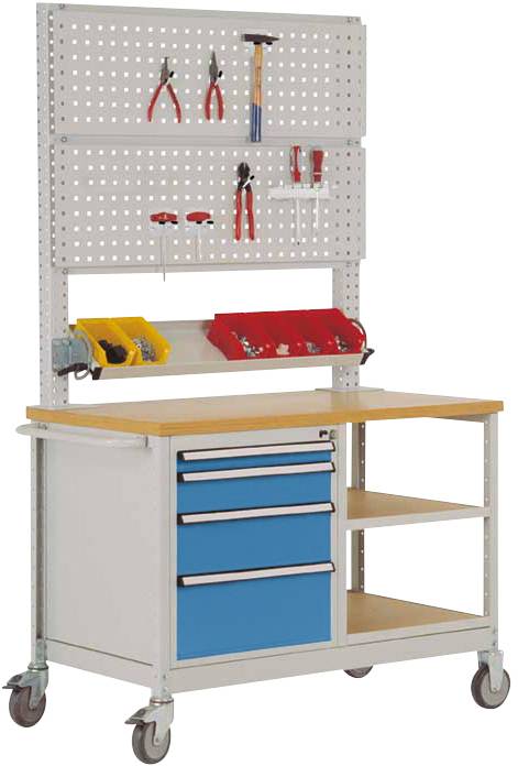 Mobile Werkbank Modell 6 - mobil und stabil in einem. Die mobile Werkbank bietet Ihnen nicht nur einen fahrbaren Arbeitsplatz, sondern zugleich noch ein verschließbares Lager für Werkzeuge und Montagematerial. Die Werkbank ist in lichtblau RAL 5012 hochwertig pulverbeschichtet. Sie ist 780 mm hoch, 1135 mm breit und hat eine Tiefe von 590 mm plus Abdeckplatte. Die mobile Werkbank ist mit zwei halben Holzverbund-Einlegeböden auf der einen Seite und auf der anderen Seite ein Stahlgehäuse mit 4 Schubfächern in den Höhen 1 x 50 mm 1 x 100 mm 1 x 150 mm 1 x 200 mm ausgestattet. Die Schubfächer sind zur Aufnahme von Fachunterteilungen im 36 mm Raster gelocht. Zu Ihrer Sicherheit ist das Gehäuse mit Einzelauszugssperren und einer Schubfachsicherung ausgestattet, welche das unbeabsichtigte herauslaufen der Schubfächer während des Fahrens verhindert. Durch ein Zylinderschloss können die Schubfächer optimal verriegelt und Ihre Werkzeuge vor Fremdentnahme geschützt werden, in der Lieferung sind 2 Schlüssel enthalten. Darüber hinaus verfügt die mobile Werkbank über ein Stahl-Aufbauportal, Lochplatten befestigt sind. Somit können Sie ihre Werkzeuge und Montagematerialien optimal am Arbeitsplatz unterbringen. Der Grundrahmen des Wagens ist äußerst robust und mit einem handlichen Schiebebügel ausgestattet, wodurch die Lenkung der mobilen Werkbank vereinfacht wird. Auf dem Grundrahmen wird die geölte Multiplex-Abdeckplatte befestigt die 30 mm stark ist, mit einer Breite von 1080 mm und einer Tiefe von 600 mm. Die Platte besteht entsprechend der DIN 68705 Teil 2 aus einer Buche-Vielschichtplatte der Güteklasse I/III. Die Multiplex-Tischplatte ist unter hohem Druck kreuzweise wasserfest verleimt nach DIN 68705 IF (IW67) sowie umweltschonend geölt. Alle Kanten und Ecken sind geschliffen und gefast. Eine Klarlackierung der Multiplexplatte ist auf Anfrage möglich. Die Multiplex-Tischplatte wird überall da eingesetzt, wo hohe mechanische Beanspruchungen, wie im Montage- und Fertigungsbereich, gefragt sind. Aufgrund der Verleimung kann die Tischplatte auch für gelegentliche Arbeiten mit feuchten Materialien eingesetzt werden. In der Lieferung sind 2 Lenkrollen und 2 Bockrollen enthalten, zu Ihrer Sicherheit sind die Lenkrollen mit Feststeller ausgestattet. Gegen Aufpreis können Sie auch 4 Lenkrollen davon 2 mit Radfeststellern bestellen (Bestell-Nr.: TV0306). Die mobile Werkbank hat eine Gesamtbreite von 1135 mm, eine Tiefe von 590 mm und eine Höhe von 810 mm.