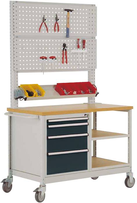 Mobile Werkbank Modell 6 - mobil und stabil in einem. Die mobile Werkbank bietet Ihnen nicht nur einen fahrbaren Arbeitsplatz, sondern zugleich noch ein verschließbares Lager für Werkzeuge und Montagematerial. Die Werkbank ist in anthrazit RAL 7016 hochwertig pulverbeschichtet. Sie ist 780 mm hoch, 1135 mm breit und hat eine Tiefe von 590 mm plus Abdeckplatte. Die mobile Werkbank ist mit zwei halben Holzverbund-Einlegeböden auf der einen Seite und auf der anderen Seite ein Stahlgehäuse mit 4 Schubfächern in den Höhen 1 x 50 mm 1 x 100 mm 1 x 150 mm 1 x 200 mm ausgestattet. Die Schubfächer sind zur Aufnahme von Fachunterteilungen im 36 mm Raster gelocht. Zu Ihrer Sicherheit ist das Gehäuse mit Einzelauszugssperren und einer Schubfachsicherung ausgestattet, welche das unbeabsichtigte herauslaufen der Schubfächer während des Fahrens verhindert. Durch ein Zylinderschloss können die Schubfächer optimal verriegelt und Ihre Werkzeuge vor Fremdentnahme geschützt werden, in der Lieferung sind 2 Schlüssel enthalten. Darüber hinaus verfügt die mobile Werkbank über ein Stahl-Aufbauportal, Lochplatten befestigt sind. Somit können Sie ihre Werkzeuge und Montagematerialien optimal am Arbeitsplatz unterbringen. Der Grundrahmen des Wagens ist äußerst robust und mit einem handlichen Schiebebügel ausgestattet, wodurch die Lenkung der mobilen Werkbank vereinfacht wird. Auf dem Grundrahmen wird die geölte Multiplex-Abdeckplatte befestigt die 30 mm stark ist, mit einer Breite von 1080 mm und einer Tiefe von 600 mm. Die Platte besteht entsprechend der DIN 68705 Teil 2 aus einer Buche-Vielschichtplatte der Güteklasse I/III. Die Multiplex-Tischplatte ist unter hohem Druck kreuzweise wasserfest verleimt nach DIN 68705 IF (IW67) sowie umweltschonend geölt. Alle Kanten und Ecken sind geschliffen und gefast. Eine Klarlackierung der Multiplexplatte ist auf Anfrage möglich. Die Multiplex-Tischplatte wird überall da eingesetzt, wo hohe mechanische Beanspruchungen, wie im Montage- und Fertigungsbereich, gefragt sind. Aufgrund der Verleimung kann die Tischplatte auch für gelegentliche Arbeiten mit feuchten Materialien eingesetzt werden. In der Lieferung sind 2 Lenkrollen und 2 Bockrollen enthalten, zu Ihrer Sicherheit sind die Lenkrollen mit Feststeller ausgestattet. Gegen Aufpreis können Sie auch 4 Lenkrollen davon 2 mit Radfeststellern bestellen (Bestell-Nr.: TV0306). Die mobile Werkbank hat eine Gesamtbreite von 1135 mm, eine Tiefe von 590 mm und eine Höhe von 810 mm.
