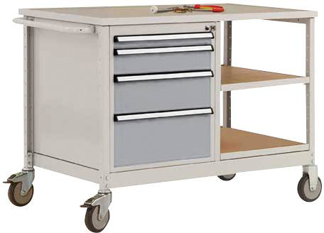 Mobile Werkbank Modell 1 - mobil und stabil in einem. Die mobile Werkbank bietet Ihnen nicht nur einen fahrbaren Arbeitsplatz, sondern zugleich noch ein verschließbares Lager für Werkzeuge und Montagematerial. Die Werkbank ist in alusilber RAL 9006 hochwertig pulverbeschichtet. Sie ist 780 mm hoch, 1135 mm breit und hat eine Tiefe von 590 mm plus Abdeckplatte. Die mobile Werkbank ist mit zwei halben Holzverbund-Einlegeböden auf der einen Seite und auf der anderen Seite mit einem Stahlgehäuse mit 4 Schubfächern in den Höhen 1 x 50 mm 1 x 100 mm 1 x 150 mm 1 x 200 mm ausgestattet. Die Schubfächer sind zur Aufnahme von Fachunterteilungen im 36 mm Raster gelocht. Zu Ihrer Sicherheit ist das Gehäuse mit Einzelauszugssperren und einer Schubfachsicherung ausgestattet, welche das unbeabsichtigte herauslaufen der Schubfächer während des Fahrens verhindert. Durch ein Zylinderschloss können die Schubfächer optimal verriegelt und Ihre Werkzeuge vor Fremdentnahme geschützt werden, in der Lieferung sind 2 Schlüssel enthalten. Der Grundrahmen des Wagens ist äußerst robust und mit einem handlichen Schiebebügel ausgestattet, wodurch die Lenkung der mobilen Werkbank vereinfacht wird. Auf dem Grundrahmen wird die lichtgraue Melamin-Abdeckplatte befestigt die 22 mm stark ist, mit einer Breite von 1080 mm und einer Tiefe von 600 mm. Die Platte besteht aus einer Melaminharzbeschichtung auf E 1 (Emissionsklasse 1) 3-Schichtspannplatte mit beidseitiger Feinstruktur. Die Melamin-Tischplatte ist weitestgehend abrieb- und kratzfest sowie blendfrei. Die glatte Oberfläche ist leicht zu reinigen. Die Tischplatte ist geeignet für Arbeiten ohne höhere mechanische und chemische Anforderung wie z.B. im Versand. In der Lieferung sind 2 Lenkrollen und 2 Bockrollen enthalten, zu Ihrer Sicherheit sind die Lenkrollen mit Feststeller ausgestattet. Gegen Aufpreis können Sie auch 4 Lenkrollen davon 2 mit Radfeststellern bestellen (Bestell-Nr.: TV0306). Die mobile Werkbank hat eine Gesamtbreite von 1135 mm, eine Tiefe von 590 mm und eine Höhe von 802 mm.