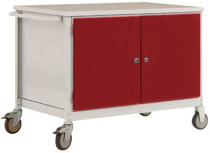 Mobile Werkbank Modell 5 - mobil und stabil in einem. Die mobile Werkbank bietet Ihnen nicht nur einen fahrbaren Arbeitsplatz, sondern zugleich noch ein verschließbares Lager für Werkzeuge und Montagematerial. Die Werkbank ist in rubinrot RAL 3003 hochwertig pulverbeschichtet. Sie ist 780 mm hoch, 1135 mm breit und hat eine Tiefe von 590 mm plus Abdeckplatte. Die mobile Werkbank ist mit zwei Stahlgehäusen, 1 x mit Türanschlag links und 1x rechts, ausgestattet. In den Gehäusen befinden sich zwei feste Einlegeböden. Durch ein Zylinderschloss mit je 2 Schlüsseln können die Türen optimal verriegelt und Ihre Werkzeuge vor Fremdentnahme geschützt werden. Der Grundrahmen des Wagens ist äußerst robust und mit einem handlichen Schiebebügel ausgestattet, wodurch die Lenkung der mobilen Werkbank vereinfacht wird. Auf dem Grundrahmen wird die lichtgraue Melamin-Abdeckplatte befestigt die 22 mm stark ist, mit einer Breite von 1080 mm und einer Tiefe von 600 mm. Die Platte besteht aus einer Melaminharzbeschichtung auf E 1 (Emissionsklasse 1) 3-Schichtspannplatte mit beidseitiger Feinstruktur. Die Melamin-Tischplatte ist weitestgehend abrieb- und kratzfest sowie blendfrei. Die glatte Oberfläche ist leicht zu reinigen. Die Tischplatte ist geeignet für Arbeiten ohne höhere mechanische und chemische Anforderung wie z.B. im Versand. In der Lieferung sind 2 Lenkrollen und 2 Bockrollen enthalten, zu Ihrer Sicherheit sind die Lenkrollen mit Feststeller ausgestattet. Gegen Aufpreis können Sie auch 4 Lenkrollen davon 2 mit Radfeststellern bestellen (Bestell-Nr.: TV0306). Die mobile Werkbank hat eine Gesamtbreite von 1135 mm, eine Tiefe von 590 mm und eine Höhe von 802 mm.