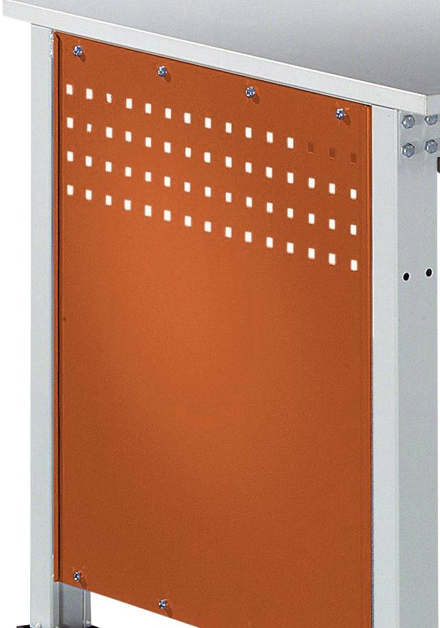 Schöne Optik auch am Arbeitsplatz! Durch extra Seitenblenden kann auch ein funktioneller Arbeitsplatz ein Blickfang sein und Spaß machen. Aber nicht nur aus optischen Gesichtspunkten bieten Seitenblenden viele Vorteile. Durch die 38 mm Lochrasterung können Arbeitshilfen wie Flaschen- oder Lappenhalter direkt am Arbeitsplatz positioniert werden. So entfällt langes Suchen und die Frustration bleibt aus. Natürlich können auch ganz klassisch Werkzeuge über Halter oder Haken in Greifnähe angebracht werden. Die Entscheidung liegt bei Ihnen! Die Seitenblende ist für alle UNIVERSAL Arbeitstische Standard mit einer Tischtiefe von 800 mm geeignet. Die 606 mm Breite und 4 mm Tiefe sowie 606 mm hohe Seitenblende kann sowohl links als auch rechts am Fußrahmen des Arbeitsplatzes befestigt werden. Die Seitenblende ist hochwertig pulverbeschichtet in Rotorange RAL 2001. Eine Montage in Verbindung mit Zwischenböden ist nur auf Anfrage möglich.
