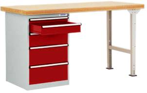 Ersparen Sie sich ein langes Suchen und mühsames Zusammenstellen von einzelnen Werkbankkomponenten, nutzen Sie unsere Erfahrung! Mit dem Werkbanksystem COMBI von unseren Experten zusammengestellten, praxisbewährten und preisgünstigen Angebot schaffen Sie die optimale Grundlage für den Arbeitsbereich. Das Werkbanksystem COMBI verbindet die klassische Werkbank mit dem bekannten Standgehäuse zur Nutzung beider Einsatzbereiche in einem System. Mechanische Montage- oder Fertigungsarbeiten werden an der Werkbank ausgeübt, das Standgehäuse stellt ausreichend Platz zur Lagerung der benötigten Werkzeuge und Materialien bereit. Somit lassen sich unabhängige Arbeitsplätze erschaffen, ein zeitraubendes Suchen von Material und Werkzeug ist nicht notwendig. Das Werkbanksystem COMBI 1500 mm breit und 700 mm tief ist äußerst stabil und langlebig durch den äußerst robusten Fußrahmen und dem Gehäuse . Sie ist 800 mm hoch plus Werkbankplatte. Durch die hohe Tragkraft von 300 kg (bei gleichmäßiger Lastverteilung) ist die Werkbank für mechanische Beanspruchung in Produktion oder Montage geeignet. Der Einzel-Fußrahmen besteht aus 1 Stahlprofilrahmen 40 x 50 mm und Gummischuhen (6 mm) zur Schonung des Bodenbelags. Der Fußrahmen ist hochwertig pulverbeschichtet in rubinrot RAL 3003. Das Gehäuse besteht aus einer massiven und verstärkten Stahlblechkonstruktion mit einer 50 mm Lochrasterung zur individuellen Einteilung. Das Gehäuse ist in rubinrot RAL 3003 hochwertig pulverbeschichtet. Serienmäßig ausgestattet ist das Gehäuse mit Zylinderschloss und 2 Schlüsseln sowie mit Zentralverschluss. Darüber hinaus ist der Schubfachschrank noch mit einer Einzelauszugssperre ausgestattet. Diese verhindert das unbeabsichtigte, gleichzeitige Öffnen von mehreren Schubfächern und verringert somit die Quetsch- und Verletzungsgefahr. Das Standgehäuse hat eine Breite von 500, eine Tiefe von 580 mm und eine Höhe von 800 mm. Durch die solide Bauart ist das Standgehäuse mit 300 kg belastbar. Das Standgehäuse ist mit 5 Schubfächern in folgenden Blendenaufteilungen ausgestattet: 1 x 50 mm, 1 x 100 mm, 1 x 150 mm, 2 x 200 mm Die Schubfächer sind zur Aufnahme von Fachunterteilungen im 36 mm Raster gelocht. Die Schubfächer sind bis 80 % ausziehbar und bis 35 kg belastbar. Die Schubfächer sind mit einer großen Griffleiste und für das Beschriften der Schubfächer zusätzlich mit Etikett ausgestattet. Die geölte Multiplex-Werkbankplatte ist 40 mm stark, 1500 mm breit und 700 mm tief, besteht entsprechend der DIN 68705 Teil 2 aus einer Buche-Vielschichtplatte der Güteklasse I/III. Die Multiplex-Werkbankplatte ist unter hohem Druck kreuzweise wasserfest verleimt nach DIN 68705 IF (IW67) sowie umweltschonend geölt. Alle Kanten und Ecken sind geschliffen und gefast. Eine Klarlackierung der Multiplexplatte ist auf Anfrage möglich. Die Multiplex-Werkbankplatte ist für den Profi Einsatz, bei sehr hoher mechanischer Beanspruchung im Montage- und Fertigungsbereich geeignet. Aufgrund der Verleimung kann die Tischplatte auch für gelegentliche Arbeiten mit feuchten Materialien eingesetzt werden. Auf Anfrage ist die Werkbank Combi auch in leitfähiger Ausführung lieferbar.