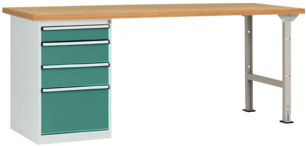 Ersparen Sie sich ein langes Suchen und mühsames Zusammenstellen von einzelnen Werkbankkomponenten, nutzen Sie unsere Erfahrung! Mit dem Werkbanksystem COMBI von unseren Experten zusammengestellten, praxisbewährten und preisgünstigen Angebot schaffen Sie die optimale Grundlage für den Arbeitsbereich. Das Werkbanksystem COMBI verbindet die klassische Werkbank mit dem bekannten Standgehäuse zur Nutzung beider Einsatzbereiche in einem System. Mechanische Montage- oder Fertigungsarbeiten werden an der Werkbank ausgeübt, das Standgehäuse stellt ausreichend Platz zur Lagerung der benötigten Werkzeuge und Materialien bereit. Somit lassen sich unabhängige Arbeitsplätze erschaffen, ein zeitraubendes Suchen von Material und Werkzeug ist nicht notwendig. Das Werkbanksystem COMBI 1500 mm breit und 700 mm tief ist äußerst stabil und langlebig durch den äußerst robusten Fußrahmen und dem Gehäuse . Sie ist 800 mm hoch plus Werkbankplatte. Durch die hohe Tragkraft von 300 kg (bei gleichmäßiger Lastverteilung) ist die Werkbank für mechanische Beanspruchung in Produktion oder Montage geeignet. Der Einzel-Fußrahmen besteht aus 1 Stahlprofilrahmen 40 x 50 mm und Gummischuhen (6 mm) zur Schonung des Bodenbelags. Der Fußrahmen ist hochwertig pulverbeschichtet in graugrün HF 0001. Das Gehäuse besteht aus einer massiven und verstärkten Stahlblechkonstruktion mit einer 50 mm Lochrasterung zur individuellen Einteilung. Das Gehäuse ist in graugrün HF 0001 hochwertig pulverbeschichtet. Serienmäßig ausgestattet ist das Gehäuse mit Zylinderschloss und 2 Schlüsseln sowie mit Zentralverschluss. Darüber hinaus ist der Schubfachschrank noch mit einer Einzelauszugssperre ausgestattet. Diese verhindert das unbeabsichtigte, gleichzeitige Öffnen von mehreren Schubfächern und verringert somit die Quetsch- und Verletzungsgefahr. Das Standgehäuse hat eine Breite von 500, eine Tiefe von 580 mm und eine Höhe von 800 mm. Durch die solide Bauart ist das Standgehäuse mit 300 kg belastbar. Das Standgehäuse ist mit 4 Schubfächern in folgenden Blendenaufteilungen ausgestattet: 1 x 100 mm, 2 x 150 mm, 1 x 300 mm Die Schubfächer sind zur Aufnahme von Fachunterteilungen im 36 mm Raster gelocht. Die Schubfächer sind bis 80 % ausziehbar und bis 35 kg belastbar. Die Schubfächer sind mit einer großen Griffleiste und für das Beschriften der Schubfächer zusätzlich mit Etikett ausgestattet. Bekanntes deutsches Qualitätsprodukt! Die massive Buche-Werkbankplatte 40 mm stark, 1500 mm breit und 700 mm tief, besteht aus keilverzinkte und riegelverleimte Laubholzlamellen (Buche, Eiche etc.), welche geschliffen und umweltschonend oberflächenbearbeitet wird. Sie ist abrieb-, stoß- und schlagfest, sehr strapazier- und widerstandsfähig sowie gegen Feuchtigkeit geschützt. Die massive Buche-Werkbankplatte ist für den Profi Einsatz, bei sehr hoher mechanischer Beanspruchung im Montage- und Fertigungsbereich, geeignet. Auf Anfrage ist die Werkbank Combi auch in leitfähiger Ausführung lieferbar.