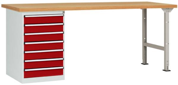 Ersparen Sie sich ein langes Suchen und mühsames Zusammenstellen von einzelnen Werkbankkomponenten, nutzen Sie unsere Erfahrung! Mit dem Werkbanksystem COMBI von unseren Experten zusammengestellten, praxisbewährten und preisgünstigen Angebot schaffen Sie die optimale Grundlage für den Arbeitsbereich. Das Werkbanksystem COMBI verbindet die klassische Werkbank mit dem bekannten Standgehäuse zur Nutzung beider Einsatzbereiche in einem System. Mechanische Montage- oder Fertigungsarbeiten werden an der Werkbank ausgeübt, das Standgehäuse stellt ausreichend Platz zur Lagerung der benötigten Werkzeuge und Materialien bereit. Somit lassen sich unabhängige Arbeitsplätze erschaffen, ein zeitraubendes Suchen von Material und Werkzeug ist nicht notwendig. Das Werkbanksystem COMBI 2000 mm breit und 700 mm tief ist äußerst stabil und langlebig durch den äußerst robusten Fußrahmen und dem Gehäuse . Sie ist 800 mm hoch plus Werkbankplatte. Durch die hohe Tragkraft von 300 kg (bei gleichmäßiger Lastverteilung) ist die Werkbank für mechanische Beanspruchung in Produktion oder Montage geeignet. Der Einzel-Fußrahmen besteht aus 1 Stahlprofilrahmen 40 x 50 mm und Gummischuhen (6 mm) zur Schonung des Bodenbelags. Der Fußrahmen ist hochwertig pulverbeschichtet in rubinrot RAL 3003. Das Gehäuse besteht aus einer massiven und verstärkten Stahlblechkonstruktion mit einer 50 mm Lochrasterung zur individuellen Einteilung. Das Gehäuse ist in rubinrot RAL 3003 hochwertig pulverbeschichtet. Serienmäßig ausgestattet ist das Gehäuse mit Zylinderschloss und 2 Schlüsseln sowie mit Zentralverschluss. Darüber hinaus ist der Schubfachschrank noch mit einer Einzelauszugssperre ausgestattet. Diese verhindert das unbeabsichtigte, gleichzeitige Öffnen von mehreren Schubfächern und verringert somit die Quetsch- und Verletzungsgefahr. Das Standgehäuse hat eine Breite von 500, eine Tiefe von 580 mm und eine Höhe von 800 mm. Durch die solide Bauart ist das Standgehäuse mit 300 kg belastbar. Das Standgehäuse ist mit 7 Schubfächern in folgenden Blendenaufteilungen ausgestattet: 7 x 100 mm Die Schubfächer sind zur Aufnahme von Fachunterteilungen im 36 mm Raster gelocht. Die Schubfächer sind bis 80 % ausziehbar und bis 35 kg belastbar. Die Schubfächer sind mit einer großen Griffleiste und für das Beschriften der Schubfächer zusätzlich mit Etikett ausgestattet. Die geölte Multiplex-Werkbankplatte ist 40 mm stark, 2000 mm breit und 700 mm tief, besteht entsprechend der DIN 68705 Teil 2 aus einer Buche-Vielschichtplatte der Güteklasse I/III. Die Multiplex-Werkbankplatte ist unter hohem Druck kreuzweise wasserfest verleimt nach DIN 68705 IF (IW67) sowie umweltschonend geölt. Alle Kanten und Ecken sind geschliffen und gefast. Eine Klarlackierung der Multiplexplatte ist auf Anfrage möglich. Die Multiplex-Werkbankplatte ist für den Profi Einsatz, bei sehr hoher mechanischer Beanspruchung im Montage- und Fertigungsbereich geeignet. Aufgrund der Verleimung kann die Tischplatte auch für gelegentliche Arbeiten mit feuchten Materialien eingesetzt werden. Auf Anfrage ist die Werkbank Combi auch in leitfähiger Ausführung lieferbar.