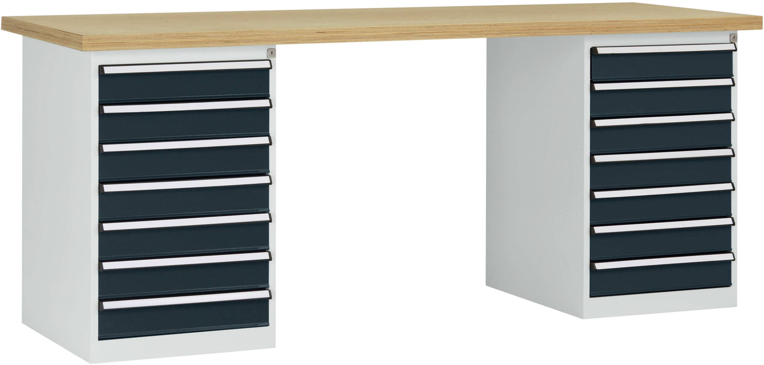 Ersparen Sie sich ein langes Suchen und mühsames Zusammenstellen von einzelnen Werkbankkomponenten, nutzen Sie unsere Erfahrung! Mit dem Werkbanksystem COMBI von unseren Experten zusammengestellten, praxisbewährten und preisgünstigen Angebot schaffen Sie die optimale Grundlage für den Arbeitsbereich. Das Werkbanksystem COMBI verbindet die klassische Werkbank mit dem bekannten Standgehäuse zur Nutzung beider Einsatzbereiche in einem System. Mechanische Montage- oder Fertigungsarbeiten werden an der Werkbank ausgeübt, das Standgehäuse stellt ausreichend Platz zur Lagerung der benötigten Werkzeuge und Materialien bereit. Somit lassen sich unabhängige Arbeitsplätze erschaffen, ein zeitraubendes Suchen von Material und Werkzeug ist nicht notwendig. Das Werkbanksystem COMBI ist 2000 mm breit und 700 mm tief ist äußerst stabil und langlebig durch das selbsttragende Stahlrahmengestell und Gehäuse. Sie ist 800 mm hoch plus Werkbankplatte. Durch die hohe Tragkraft von 300 kg (bei gleichmäßiger Lastverteilung) ist die Werkbank für mechanische Beanspruchung in Produktion oder Montage geeignet. Die beiden Gehäuse bestehen aus einer massiven und verstärkten Stahlblechkonstruktion mit einer 50 mm Lochrasterung zur individuellen Einteilung. Die Gehäuse sind in Anthrazit RAL 7016 hochwertig pulverbeschichtet. Serienmäßig ausgestattet sind die Gehäuse mit Zylinderschloss und 2 Schlüsseln sowie mit Zentralverschluss. Darüber hinaus sind die Schubfachschränke noch mit einer Einzelauszugssperre ausgestattet. Diese verhindert das unbeabsichtigte, gleichzeitige Öffnen von mehreren Schubfächern und verringert somit die Quetsch- und Verletzungsgefahr. Die Standgehäuse haben eine Breite von 500, eine Tiefe von 580 mm und eine Höhe von 800 mm. Durch die solide Bauart sind die Standgehäuse mit 300 kg belastbar. Die Standgehäuse sind mit 7 Schubfächern in folgenden Blendenaufteilungen ausgestattet: 7 x 100 mm Die Schubfächer sind zur Aufnahme von Fachunterteilungen im 36 mm Raster gelocht. Die Schubfächer sind bis 80 % ausziehbar und bis 35 kg belastbar. Die Schubfächer sind mit einer großen Griffleiste und für das Beschriften der Schubfächer zusätzlich mit Etikett ausgestattet. Die geölte Multiplex-Werkbankplatte ist 40 mm stark, 2000 mm breit und 700 mm tief, besteht entsprechend der DIN 68705 Teil 2 aus einer Buche-Vielschichtplatte der Güteklasse I/III. Die Multiplex-Werkbankplatte ist unter hohem Druck kreuzweise wasserfest verleimt nach DIN 68705 IF (IW67) sowie umweltschonend geölt. Alle Kanten und Ecken sind geschliffen und gefast. Eine Klarlackierung der Multiplexplatte ist auf Anfrage möglich. Die Multiplex-Werkbankplatte ist für den Profi Einsatz, bei sehr hoher mechanischer Beanspruchung im Montage- und Fertigungsbereich geeignet. Aufgrund der Verleimung kann die Tischplatte auch für gelegentliche Arbeiten mit feuchten Materialien eingesetzt werden. Auf Anfrage ist die Werkbank Combi auch in leitfähiger Ausführung lieferbar.