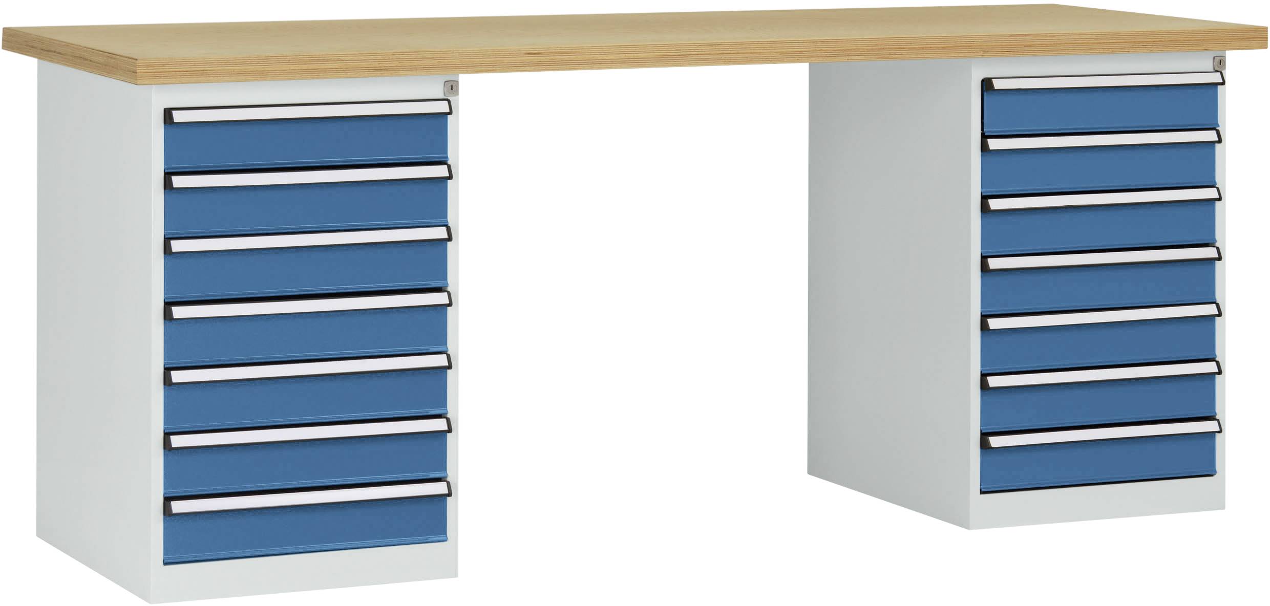 Ersparen Sie sich ein langes Suchen und mühsames Zusammenstellen von einzelnen Werkbankkomponenten, nutzen Sie unsere Erfahrung! Mit dem Werkbanksystem COMBI von unseren Experten zusammengestellten, praxisbewährten und preisgünstigen Angebot schaffen Sie die optimale Grundlage für den Arbeitsbereich. Das Werkbanksystem COMBI verbindet die klassische Werkbank mit dem bekannten Standgehäuse zur Nutzung beider Einsatzbereiche in einem System. Mechanische Montage- oder Fertigungsarbeiten werden an der Werkbank ausgeübt, das Standgehäuse stellt ausreichend Platz zur Lagerung der benötigten Werkzeuge und Materialien bereit. Somit lassen sich unabhängige Arbeitsplätze erschaffen, ein zeitraubendes Suchen von Material und Werkzeug ist nicht notwendig. Das Werkbanksystem COMBI ist 2000 mm breit und 700 mm tief ist äußerst stabil und langlebig durch das selbsttragende Stahlrahmengestell und Gehäuse. Sie ist 800 mm hoch plus Werkbankplatte. Durch die hohe Tragkraft von 300 kg (bei gleichmäßiger Lastverteilung) ist die Werkbank für mechanische Beanspruchung in Produktion oder Montage geeignet. Die beiden Gehäuse bestehen aus einer massiven und verstärkten Stahlblechkonstruktion mit einer 50 mm Lochrasterung zur individuellen Einteilung. Die Gehäuse sind in Lichtgrau RAL 7035/Brillantblau RAL 5007 hochwertig pulverbeschichtet. Serienmäßig ausgestattet sind die Gehäuse mit Zylinderschloss und 2 Schlüsseln sowie mit Zentralverschluss. Darüber hinaus sind die Schubfachschränke noch mit einer Einzelauszugssperre ausgestattet. Diese verhindert das unbeabsichtigte, gleichzeitige Öffnen von mehreren Schubfächern und verringert somit die Quetsch- und Verletzungsgefahr. Die Standgehäuse haben eine Breite von 500, eine Tiefe von 580 mm und eine Höhe von 800 mm. Durch die solide Bauart sind die Standgehäuse mit 300 kg belastbar. Die Standgehäuse sind mit 7 Schubfächern in folgenden Blendenaufteilungen ausgestattet: 7 x 100 mm Die Schubfächer sind zur Aufnahme von Fachunterteilungen im 36 mm Raster gelocht. Die Schubfächer sind bis 80 % ausziehbar und bis 35 kg belastbar. Die Schubfächer sind mit einer großen Griffleiste und für das Beschriften der Schubfächer zusätzlich mit Etikett ausgestattet. Bekanntes deutsches Qualitätsprodukt! Die massive Buche-Werkbankplatte 40 mm stark, 2000 mm breit und 700 mm tief, besteht aus keilverzinkte und riegelverleimte Laubholzlamellen (Buche, Eiche etc.), welche geschliffen und umweltschonend oberflächenbearbeitet wird. Sie ist abrieb-, stoß- und schlagfest, sehr strapazier- und widerstandsfähig sowie gegen Feuchtigkeit geschützt. Die massive Buche-Werkbankplatte ist für den Profi Einsatz, bei sehr hoher mechanischer Beanspruchung im Montage- und Fertigungsbereich, geeignet. Auf Anfrage ist die Werkbank Combi auch in leitfähiger Ausführung lieferbar.