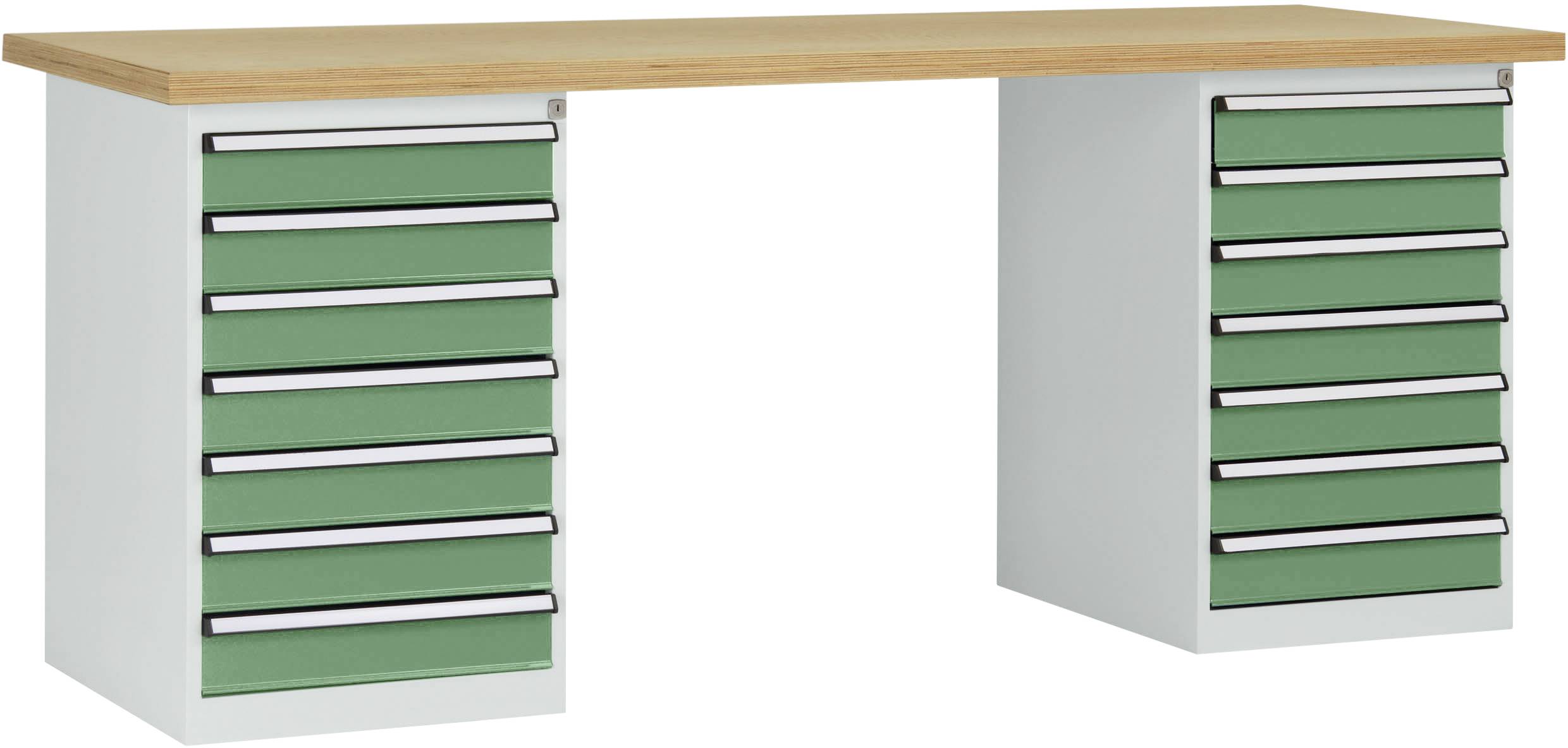 Ersparen Sie sich ein langes Suchen und mühsames Zusammenstellen von einzelnen Werkbankkomponenten, nutzen Sie unsere Erfahrung! Mit dem Werkbanksystem COMBI von unseren Experten zusammengestellten, praxisbewährten und preisgünstigen Angebot schaffen Sie die optimale Grundlage für den Arbeitsbereich. Das Werkbanksystem COMBI verbindet die klassische Werkbank mit dem bekannten Standgehäuse zur Nutzung beider Einsatzbereiche in einem System. Mechanische Montage- oder Fertigungsarbeiten werden an der Werkbank ausgeübt, das Standgehäuse stellt ausreichend Platz zur Lagerung der benötigten Werkzeuge und Materialien bereit. Somit lassen sich unabhängige Arbeitsplätze erschaffen, ein zeitraubendes Suchen von Material und Werkzeug ist nicht notwendig. Das Werkbanksystem COMBI ist 2000 mm breit und 700 mm tief ist äußerst stabil und langlebig durch das selbsttragende Stahlrahmengestell und Gehäuse. Sie ist 800 mm hoch plus Werkbankplatte. Durch die hohe Tragkraft von 300 kg (bei gleichmäßiger Lastverteilung) ist die Werkbank für mechanische Beanspruchung in Produktion oder Montage geeignet. Die beiden Gehäuse bestehen aus einer massiven und verstärkten Stahlblechkonstruktion mit einer 50 mm Lochrasterung zur individuellen Einteilung. Die Gehäuse sind in Resedagrün RAL 6011 hochwertig pulverbeschichtet. Serienmäßig ausgestattet sind die Gehäuse mit Zylinderschloss und 2 Schlüsseln sowie mit Zentralverschluss. Darüber hinaus sind die Schubfachschränke noch mit einer Einzelauszugssperre ausgestattet. Diese verhindert das unbeabsichtigte, gleichzeitige Öffnen von mehreren Schubfächern und verringert somit die Quetsch- und Verletzungsgefahr. Die Standgehäuse haben eine Breite von 500, eine Tiefe von 580 mm und eine Höhe von 800 mm. Durch die solide Bauart sind die Standgehäuse mit 300 kg belastbar. Die Standgehäuse sind mit 7 Schubfächern in folgenden Blendenaufteilungen ausgestattet: 7 x 100 mm Die Schubfächer sind zur Aufnahme von Fachunterteilungen im 36 mm Raster gelocht. Die Schubfächer sind bis 80 % ausziehbar und bis 35 kg belastbar. Die Schubfächer sind mit einer großen Griffleiste und für das Beschriften der Schubfächer zusätzlich mit Etikett ausgestattet. Bekanntes deutsches Qualitätsprodukt! Die massive Buche-Werkbankplatte 40 mm stark, 2000 mm breit und 700 mm tief, besteht aus keilverzinkte und riegelverleimte Laubholzlamellen (Buche, Eiche etc.), welche geschliffen und umweltschonend oberflächenbearbeitet wird. Sie ist abrieb-, stoß- und schlagfest, sehr strapazier- und widerstandsfähig sowie gegen Feuchtigkeit geschützt. Die massive Buche-Werkbankplatte ist für den Profi Einsatz, bei sehr hoher mechanischer Beanspruchung im Montage- und Fertigungsbereich, geeignet. Auf Anfrage ist die Werkbank Combi auch in leitfähiger Ausführung lieferbar.