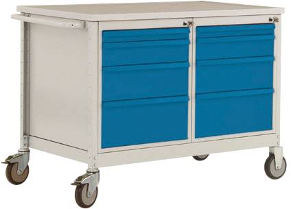 Die fortschreitende Entwicklung in der Elektronik tendiert zu immer kleineren Komponenten. Mit der ständig verkleinerten Größe diverser Bauteile werden auch die mikroskopisch kleinen Abstände zwischen den Isolatoren und Schaltungen innerhalb der Bauteile immer geringer, so dass geeignete Statikschutzmaßnahmen erforderlich werden. Winzige statische Entladungen sind für den einzelnen Menschen nicht spürbar, aber dennoch schädlich für elektronische Bauelemente und Komponenten. Erschwerend kommt hinzu, dass der entstandene Schaden, der durch die elektrostatische Ladung entsteht, mit dem bloßen Auge nicht zu erkennen ist. Elektrostatisch geschützte Bereiche und ESD-Einzelarbeitsplätze sind fast in der gesamten Elektronik- und Halbleiterfertigung erforderlich. Mit unseren ESD-Arbeitsplatzsystemen helfen wir Ihnen die elektrostatische Entladung zu vermeiden und Ihre Bauteile zu schützen. Mobile ESD-Werkbank Modell 4 - mobil und stabil in einem. Die mobile ESD-Werkbank bietet Ihnen nicht nur einen fahrbaren Arbeitsplatz, sondern zugleich dient sie Ihnen auch als einfacher Transportwagen. Die Werkbank ist in rotorange RAL 2001 leitfähig hochwertig pulverbeschichtet. Sie hat eine Breite von 1135 mm, eine Tiefe von 590 mm und eine Höhe von 780 mm plus Abdeckplatte. Die mobile Werkbank ist mit zwei Stahlgehäusen mit je 4 Schubfächern in den Höhen 1 x 50 mm 1 x 100 mm 1 x 150 mm 1 x 200 mm ausgestattet. Die Schubfächer sind zur Aufnahme von Fachunterteilungen im 36 mm Raster gelocht. Zu Ihrer Sicherheit ist das Gehäuse mit einer Einzelauszugssperre und einer Schubfachsicherung ausgestattet, welche das unbeabsichtigte herauslaufen der Schubfächer während des Fahrens verhindert. Durch ein Zylinderschloss können die Schubfächer optimal verriegelt und Ihre Werkzeuge vor Fremdentnahme geschützt werden, in der Lieferung sind 2 Schlüssel enthalten. Der Grundrahmen des Wagens ist äußerst robust und mit einem handlichen Schiebebügel ausgestattet, wodurch die Lenkung des Wagens vereinfacht wird. Auf dem Grundrahmen wird eine lichtgraue Melamin-Abdeckplatte befestigt. Die Platte ist 25 mm stark, hat eine Breite von 1080 mm und eine Tiefe von 600 mm. Die Platte besteht aus einer elektrisch leitfähigen Melaminharzbeschichtung auf volumenleitfähiger E 1 (Emissionsklasse 1) 3-Schichtspanplatte mit beidseitiger Feinstruktur. Sie verfügt über einen hellgrauen, stoßfestem Kunststoff-Umleimer. Die Melaminplatte ist elektrisch leitfähig, weitestgehend abrieb- und kratzfest nach DIN EN 438 sowie blendfrei und unempfindlich. Die glatte Oberfläche ist leicht zu reinigen. Der Ableit-Widerstand beträgt nach EN 100015 <$1x10^9>$7.5x10^5 Ohm. Die preisgünstige Platte ist geeignet für leichte mechanische Arbeiten und Arbeiten, ohne höhere chemische Beanspruchung im ESD Bereich. In der Lieferung sind 2 leitfähige Lenk- und 2 leitfähige Bock-TPE-Rollen enthalten. Sie haben einen Durchmesser von 125 mm. Zu Ihrer Sicherheit sind die Lenkrollen mit Feststeller ausgestattet.