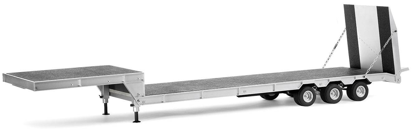 Carson Tieflade-Auflieger Carson. Passend für alle TAMIYA-Zugmaschinen. Die Rampe ist zum Befahren per Hand abklappbar. Der Auflieger ist mit drei zwillingsbereiften Achsen ausgestattet. Das Fahrwerk ist mit Blattfedern pendelnd aufgehängt. Der CNC-gefräste Rahmen besteht aus Aluminium. Alle Stützten sind mechanisch verstellbar. Die 4-Kammer Rückleuchten sind elektrisch nachrüstbar.