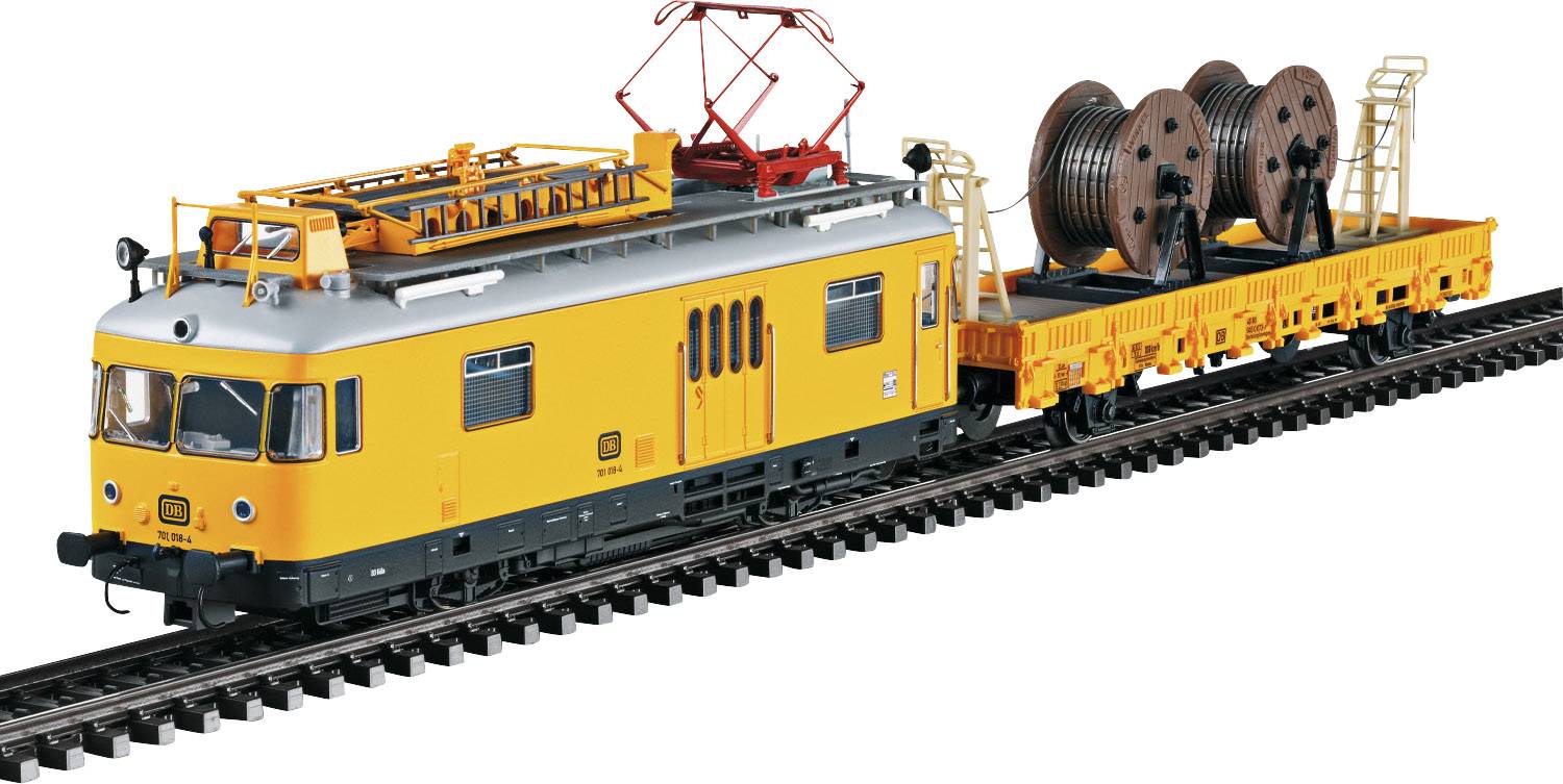 Mit Digital-Decoder mfx+ und umfangreichen Betriebs- und Geräuschfunktionen. Geregelter Hochleistungsantrieb. Wartungsfreier Motor in kompakter Bauform. 2 Achsen angetrieben. Haftreifen. Fahrtrichtungsabhängig wechselndes Dreilicht-Spitzensignal und zwei rote Schlußlichter konventionell in Betrieb, digital schaltbar. Spitzensignal vorne und hinten jeweils separat digital abschaltbar. Doppel-A-Licht-Funktion. Beleuchtung mit wartungsfreien warmweißen und roten Leuchtdioden (LED). Führerstand mit Einrichtung. Heb-, senk- und schwenkbare Arbeitsbühne, digital schaltbar und über Drehregler am Fahrgerät steuerbar. Dazu wird über Funktionstaste F1 der Zustand Fahrbetrieb oder betätigen der Arbeitsbühne im stehenden Zustand ausgewählt. Heb- und senkbarer Scherenstromabnehmer, digital schaltbar. Stromabnehmer ohne Funktion für Oberleitungsbetrieb. Spezielle Zugstange zum Anhängen des Oberleitungsbauwagens an den Turmtriebwagen liegt bei. Oberleitungsbauwagen beladen mit Kabeltrommeln und Gestelle für Seilführung. Gesamtlänge über Puffer ca. 32 cm.