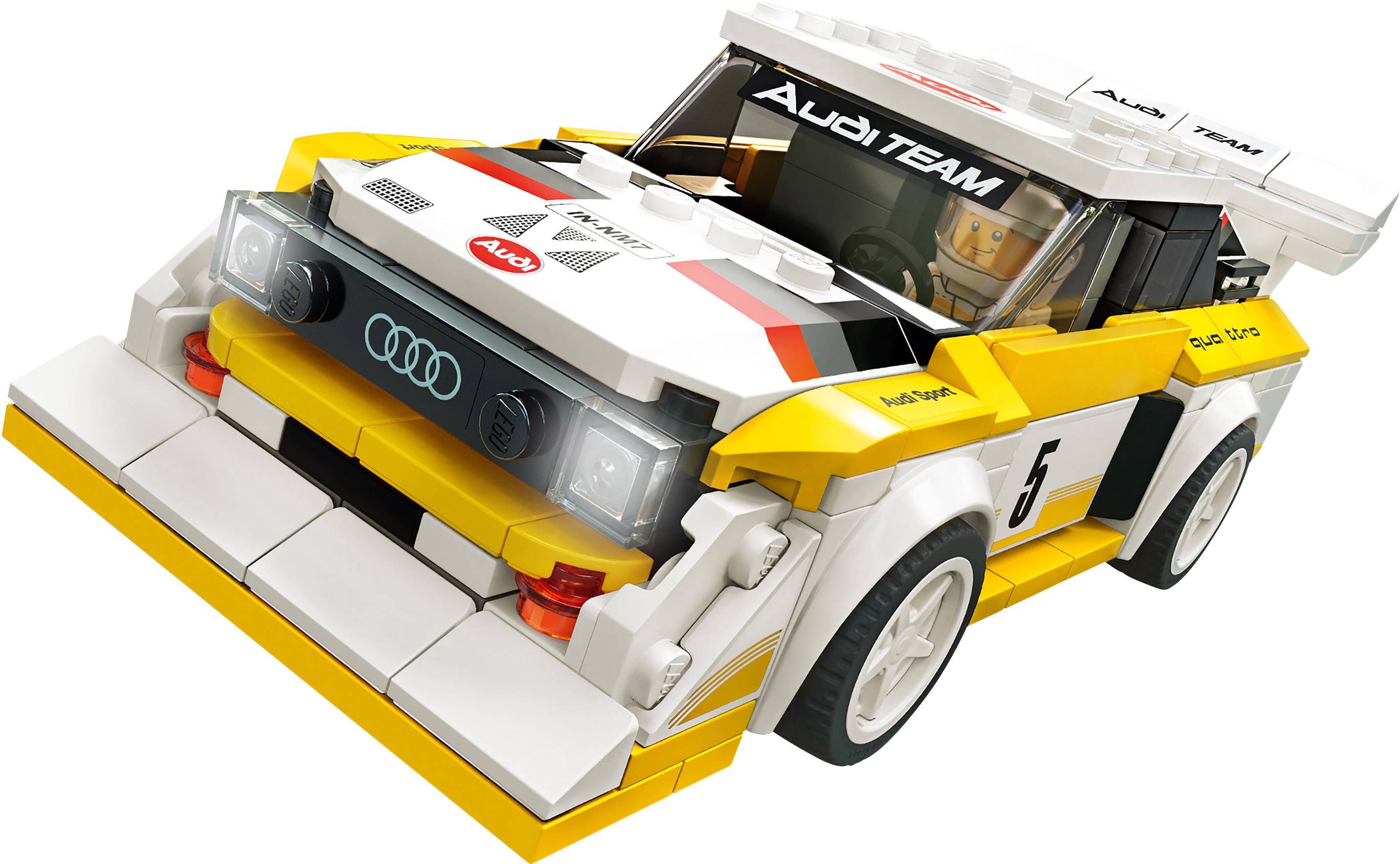 Der „1985 Audi Sport quattro S1“ (76897) war damals einer der Könige des Rallye-Sports. Jetzt haben Motorsportfans die Chance, diesen beliebten Rennwagen als Modell aus LEGO® Steinen zu bauen. Feiere das 35-jährige Jubiläum des Quattro, indem du ein Modellauto dein Eigen nennst, das diese Ikone des Rallye-Sports perfekt nachbildet. Wiedergeburt eines Rallye-Ikone! Der Modell-Rennwagen „1985 Audi Sport quattro S1“ spiegelt das berühmte Original mit der markanten gelb-weißen Lackierung, dem Frontmotor, dem wuchtigen Stoßfänger und dem gewaltigen Heckspoiler perfekt wider. Dieser Modellbausatz enthält auch eine Minifigur im „Audi Sport quattro“-Rennanzug. Setz dich ans Lenkrad dieses Audi-Spielzeugautos und hinterlasse einen bleibenden Eindruck – genau wie damals das Original! Stell das Rennspektakel perfekt nach LEGO Speed Champions Bausets bieten Fans jeden Alters die Chance, ihre Lieblingsflitzer als Modell-Rennwagen nachzubauen und den Nervenkitzel auf der Rennstrecke nachzustellen. Diese coolen Nachbildungen sind ab Januar 2020 realistischer und um 25 Prozent größer als zuvor.