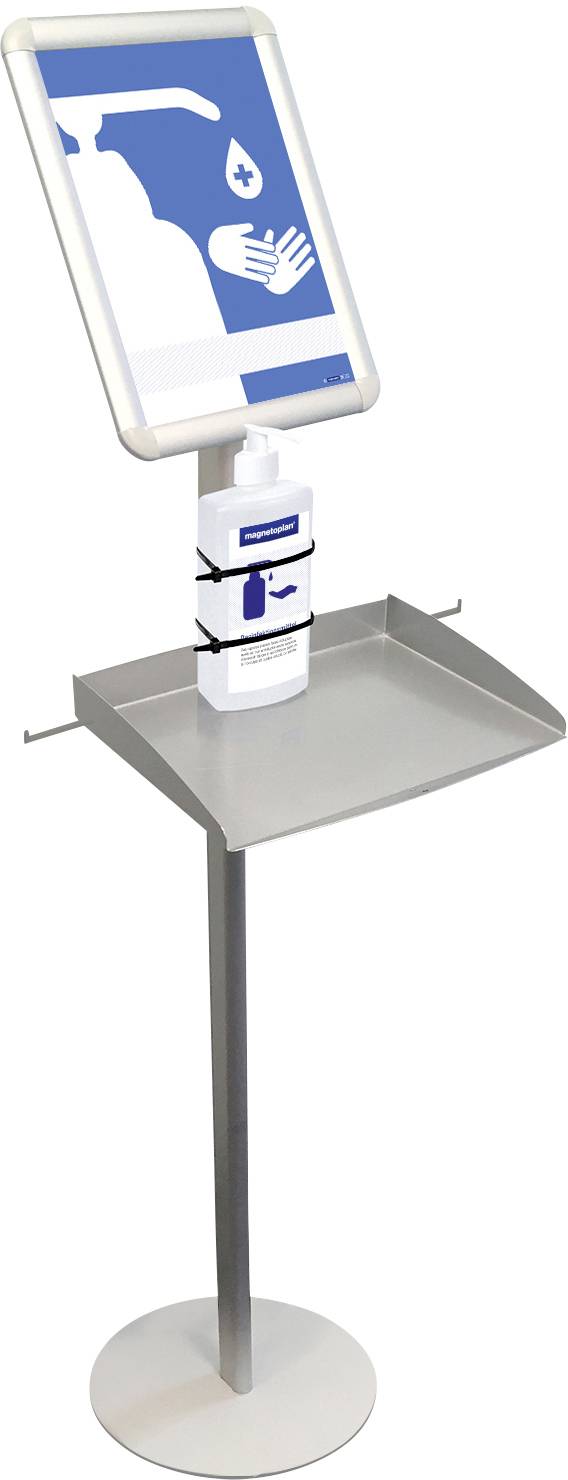 Schützen Sie sich in Büro, Werkstatt, Krankenhaus etc. vor Viren und Bakterien. Stabil & funktionell ist die neue Desinfektionsmittelstation. In den Klapprahmen lassen sich Hygiene- und Sicherheitshinweise schnell + einfach einlegen. Das praktische Tablett bietet sicheren Tropfschutz und Platz für Desinfektionsflüssigkeit. Schutzhandschuhe lassen sich an den beiden Haken aufhängen.