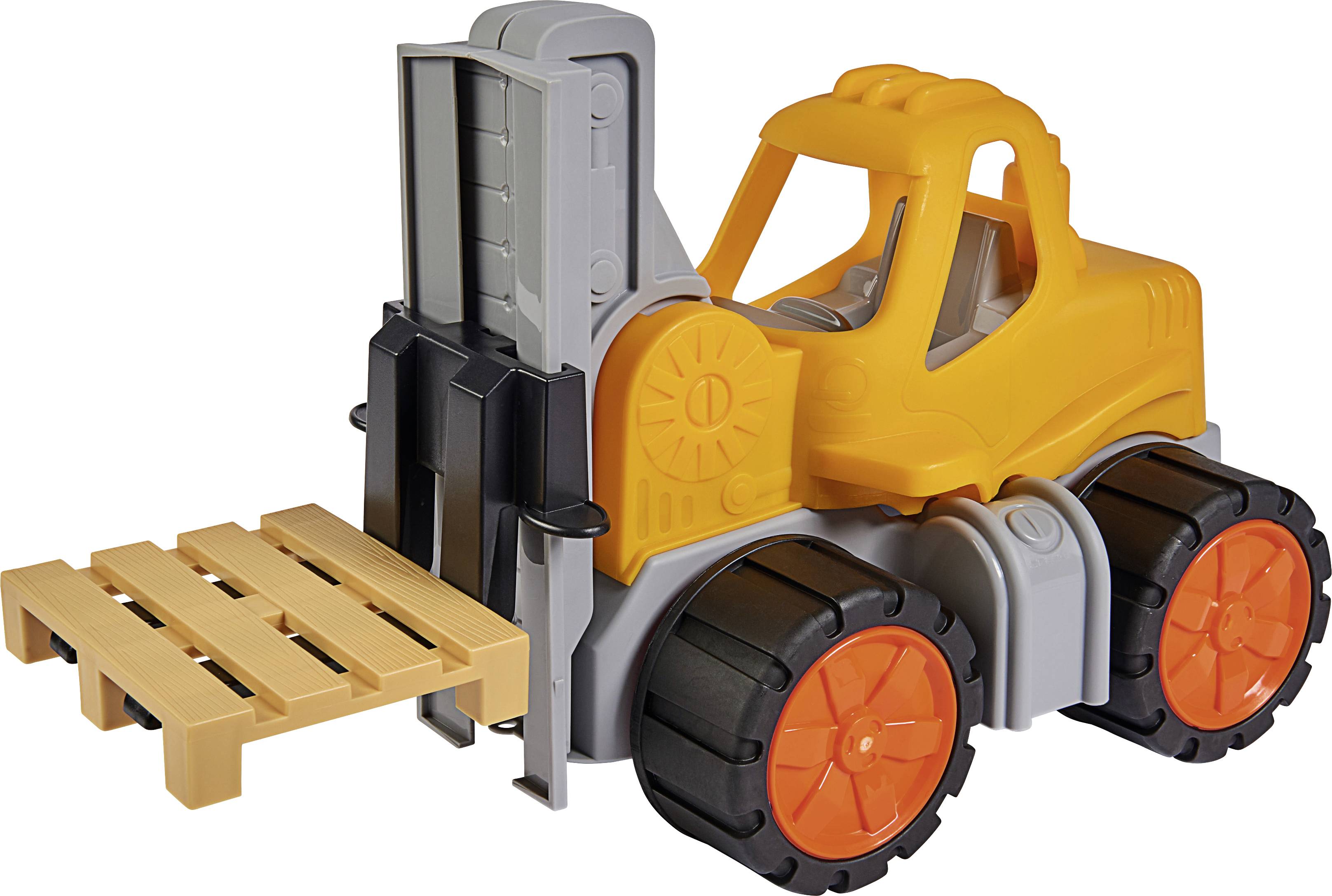 Die Funktion und die Ergonomie ist speziell auf Kinderhände abgestimmt, so dass diese die Spielfunktionen problemlos und einfach nutzen und das Fahrzeug gut schieben und transportieren können. Fröhliches Sonnengelb, Grau und leuchtend orange Akzente machen den BIG-Power-Worker Gabelstapler zum Blickfang auf kleinen Baustellen und in Spiel-Lagerhäusern. Die Reifen sind aus abriebfestem, Bodenbelag schonendem Soft-Material. Der BIG-Power-Worker Gabelstapler ist nach einem Outdoor-Einsatz hygienisch unter fließendem Wasser zu reinigen und lädt danach schön sauber im Kinderzimmer wieder fröhlich seine Palette auf.