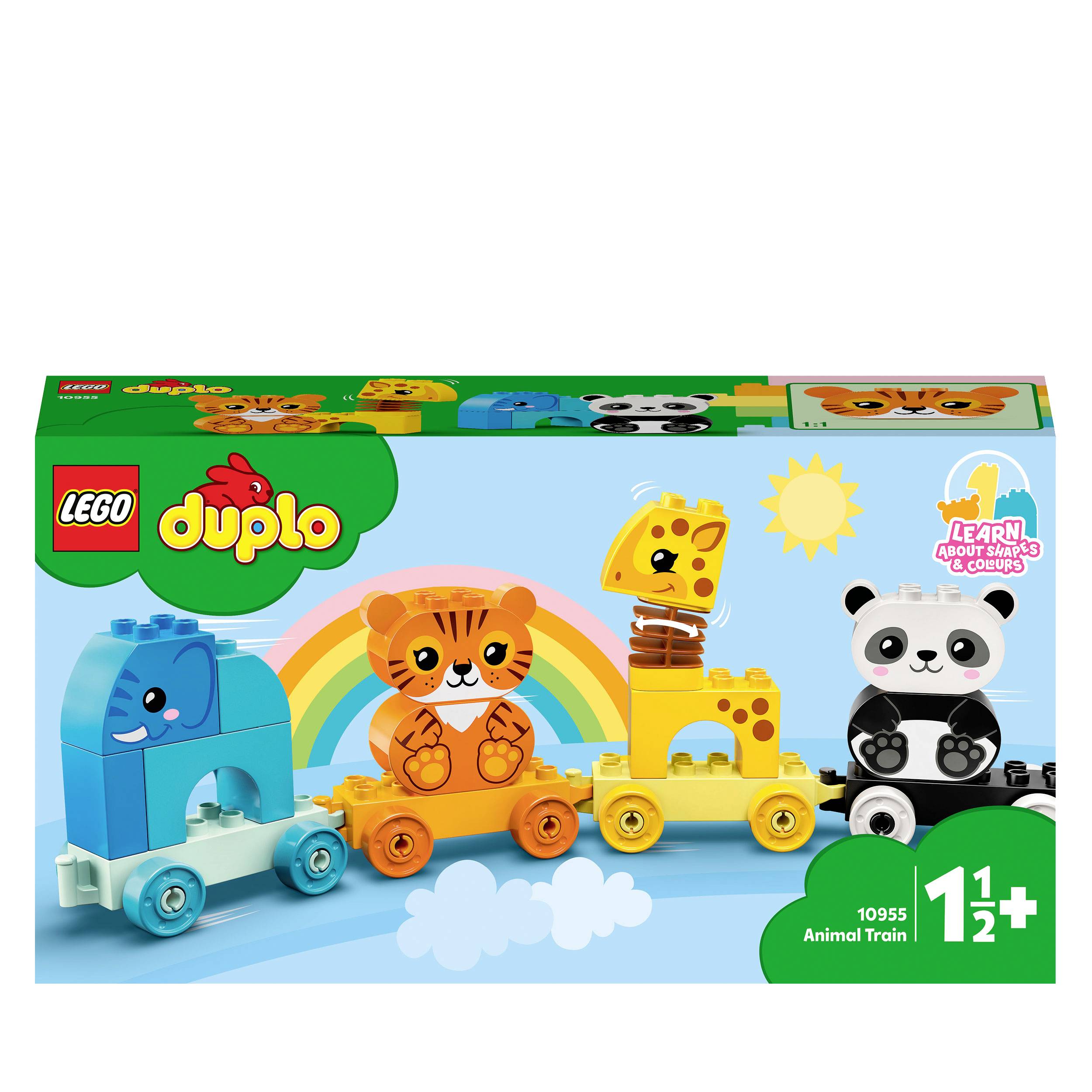 Das LEGO® DUPLO® Set Mein erster Tierzug (10955) führt Kinder spielerisch in das Tierreich ein. Spielzeug-Tierzug zum Ziehen Ein Elefant, ein Tiger, eine Giraffe und ein Panda bieten kleinen Tierfreunden jede Menge Bau- und Spielmöglichkeiten. Wenn Kleinkinder die Waggons bauen, umbauen und aufreihen und die Tiere vom Zug nehmen und stapeln, verbessern sie ihre Feinmotorik und entdecken die Magie fantasievoller Rollenspiele. Innovative Funktionen wie der Wackelhals der Giraffe verleihen diesem Lernspielzeug eine zusätzliche lustige Note. Das Set enthält Baukarten mit Bildern der Modelle (in Originalgröße), damit Kinder die Steine beim Bauen über das Bild legen können. Der Zug lässt sich jedoch auch an andere DUPLO Spielzeuge auf Rädern ankoppeln, um noch mehr Spielspaß zu vermitteln. LEGO® DUPLO® Lernspielzeuge ermöglichen Kleinkindern eine freie Selbstentfaltung und echten Lernspaß. Beim gemeinsamen Spielen lassen die Sets Eltern wichtige Entwicklungsschritte der Kinder erleben.