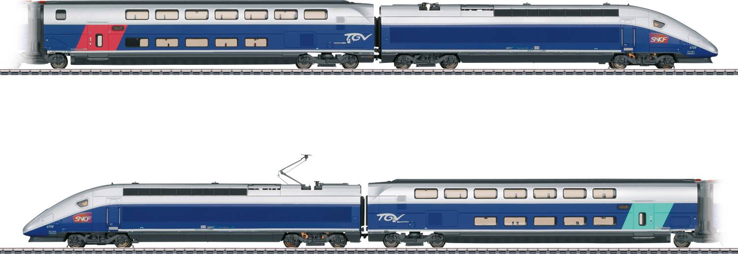Vorbild: Hochgeschwindigkeitszug TGV Euroduplex (train à grande vitesse) der Französischen Staatsbahnen (SNCF), in der Ausführung für den Verkehr zwischen Paris und München. 2 Triebköpfe (TK1 und TK2), 1 Doppelstock-Übergangswagen (R1) 1. Klasse, 1 Doppelstock-Übergangswagen (R8) 2. Klasse. Triebzugnummer 4709. Betriebszustand der Epoche VI.