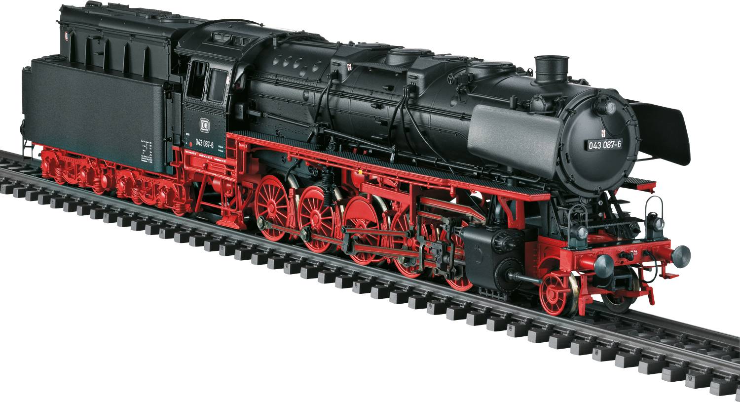 Vorbild: Schwere Güterzug-Dampflokomotive Baureihe 043, mit Öl-Tender der Einheitsbauart 2´2´T34 der Deutschen Bundesbahn (DB). Schwarz/rote Grundfarbgebung. Führerhaus mit zwei seitlichen Fenstern, mit Witte-Windleitblechen der Regelausführung, Vorlauf-Radsatz mit Speichenrädern, ohne Rauchkammer-Zentralverschluss, mit Indusi-Magneten beidseitig. Lok-Betriebsnummer 043 087-6. Betriebszustand um 1971.