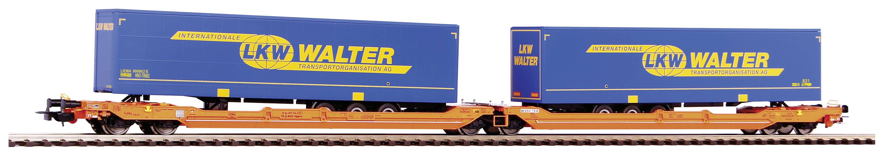 Neuheit 2021: Als PIKO Expert Produkt weist der Taschenwagen T 3000 Sdggmrss738 alle Merkmale eines hochpräzisen H0 Modells auf. Um auch als Miniatur des großen Vorbilds eine hohe Stabilität neben ausgezeichneten Laufeigenschaften zum Einsatz in schnellen Güterzügen zu gewährleisten, wurde ein Metallrahmen gewählt. Der Doppel-Wagen wird mit zwei originalgetreuen LKW-Aufliegern Walter geliefert. Damit der Modellbahner auch das PIKO Modell vorbildentsprechend für den gelegentlichen Transport von Containern heranziehen kann, sitzen auf den Seitenlangträgern Zapfen für den Containeraufsatz, die vorbildgerecht verschiebbar sind.