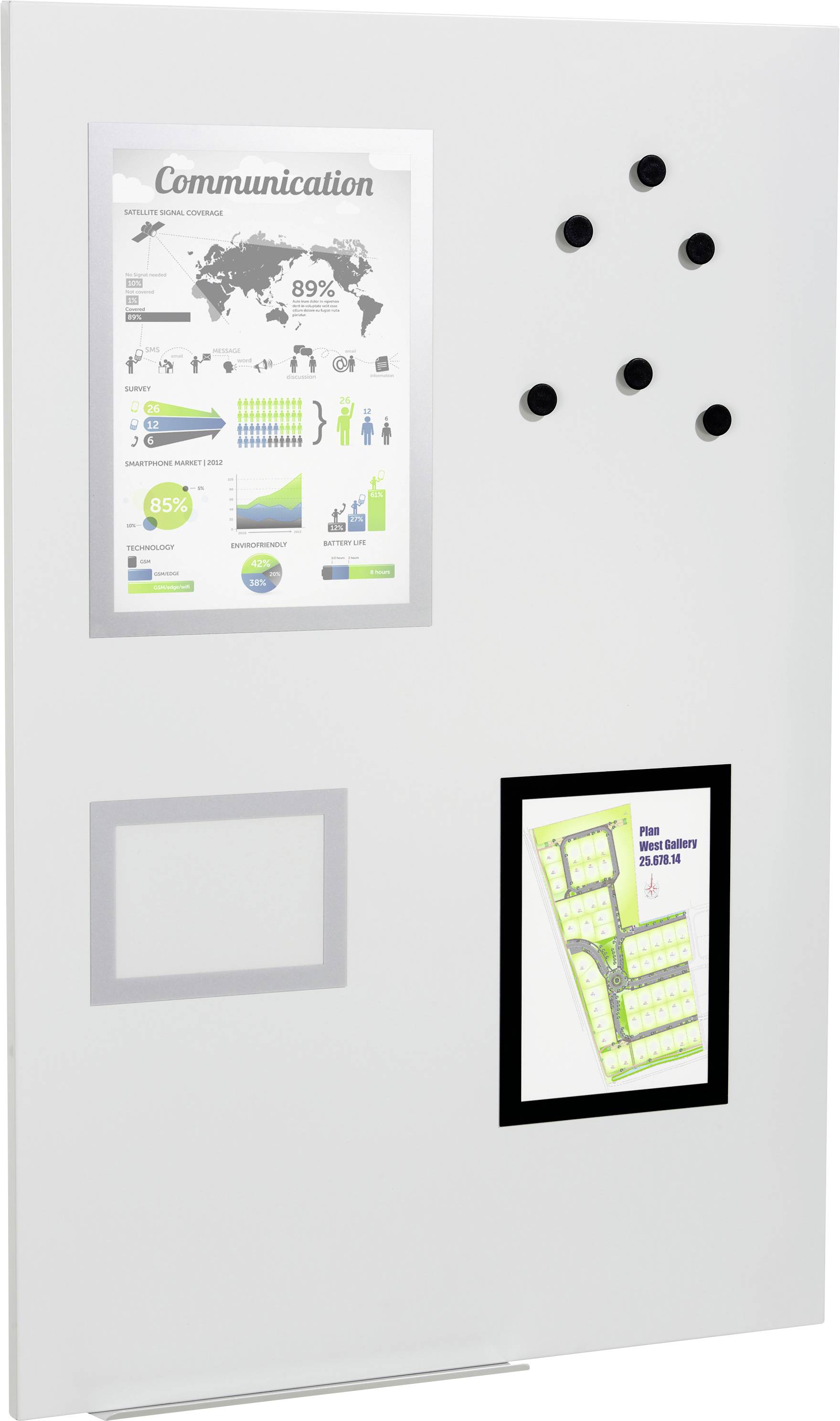 Magnettafel inkl. Zubehörset bestehend aus DURAFRAME® MAGNETIC (je 1x A4 silber, A5 schwarz, A6 silber), 6 Magnete Ø?21 mm, Stiftablage 300 x 40 mm (B x T)
