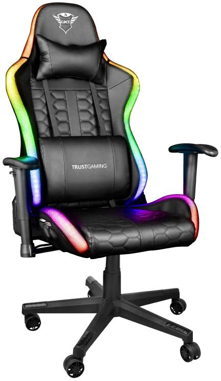 Dein Spielesessel muss zwei Eigenschaften haben: bequem sein und super aussehen. Einmal ganz ehrlich: Ein Spielsessel ist der auffälligste Teil jedes Game Rooms. Der Trust GXT 716 Rizza bietet beides: Das Nacken- und Lendenkissen bietet höchsten Sitzkomfort, während die voll integrierten Ränder mit RGB-LED-Beleuchtung stilvoll Akzente setzen, sodass der Rizza zum Mittelpunkt deines Game Rooms wird.