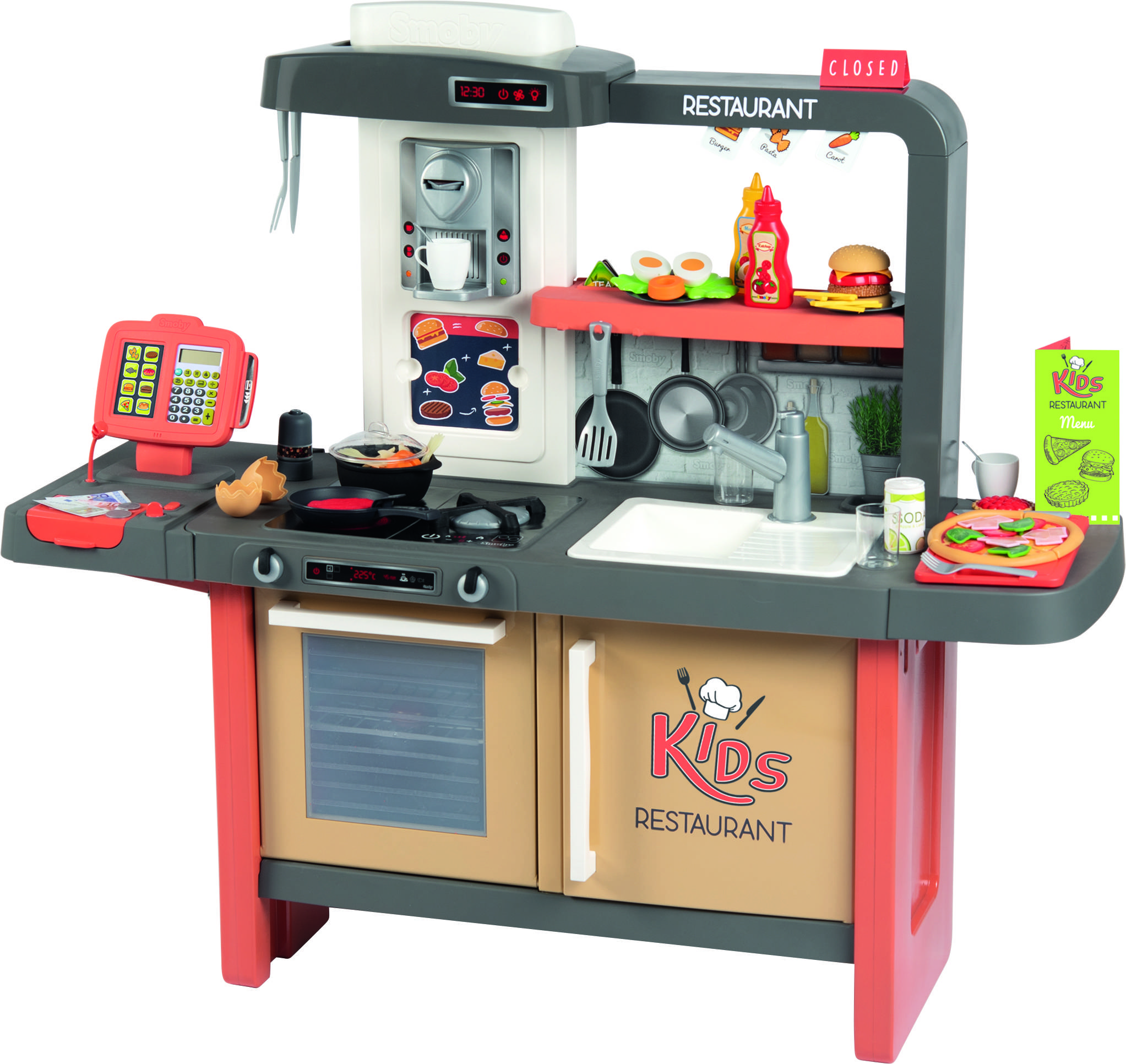 Das extra-große Smoby Kids Restaurant vereint Küchenbereich, Essbereich und Kassenbereich mit Bestelltheke und Essensausgabe in einem Produkt für unendlich viele Spielmöglichkeiten. 73 Zubehörteile runden die Premiumausstattung ab. Ob Pizza oder Burger, die sich individuell belegen lassen, Pommes mit Ketchup und Mayonnaise, Fisch, Pasta, Fleisch oder Vegetarisch, hier ist für jeden Geschmack etwas dabei. Eine große Auswahl findet sich in der Menükarte, bestimmt sind aber auch Sonderwünsche erfüllbar. Die Bestellungen können in der Spielküche zubereitet werden, die über einen Backofen, Herd mit elektronischem Kochfeld mit Sound, Kühlschrank, Spüle mit Wasserhahn und Espressomaschine verfügt. Fisch und Fleisch haben zwei unterschiedliche Seiten: roh und gebraten; die magische Pasta wechselt ihre Farbe, wenn man sie in kaltes Wasser gibt, die Karotte kann geteilt und das gekochte Ei geöffnet und halbiert werden - ganz wie in echt. Dazu kommt die Pancake-Pfanne mit der sich der Pfannkuchen kinderleicht wenden lässt, Salz- und Pfefferstreuer mit Klick-Geräusch, süße Desserts, Kochtopf, Schneidebrett, Besteck, Geschirr, Küchenhelfer und Tabs für die Espressomaschine. Im Kassenbereich kann an der integrierten elektronischen Kasse mit echtem LCD-Taschenrechner, Kreditkartenlesegerät und Spielgeldfach kassiert und bezahlt werden. Hergestellt in Frankreich. Produktmaße (LxBxH): 110 x 36 x 101 cm. Altersempfehlung: für Kinder ab 3 Jahren.