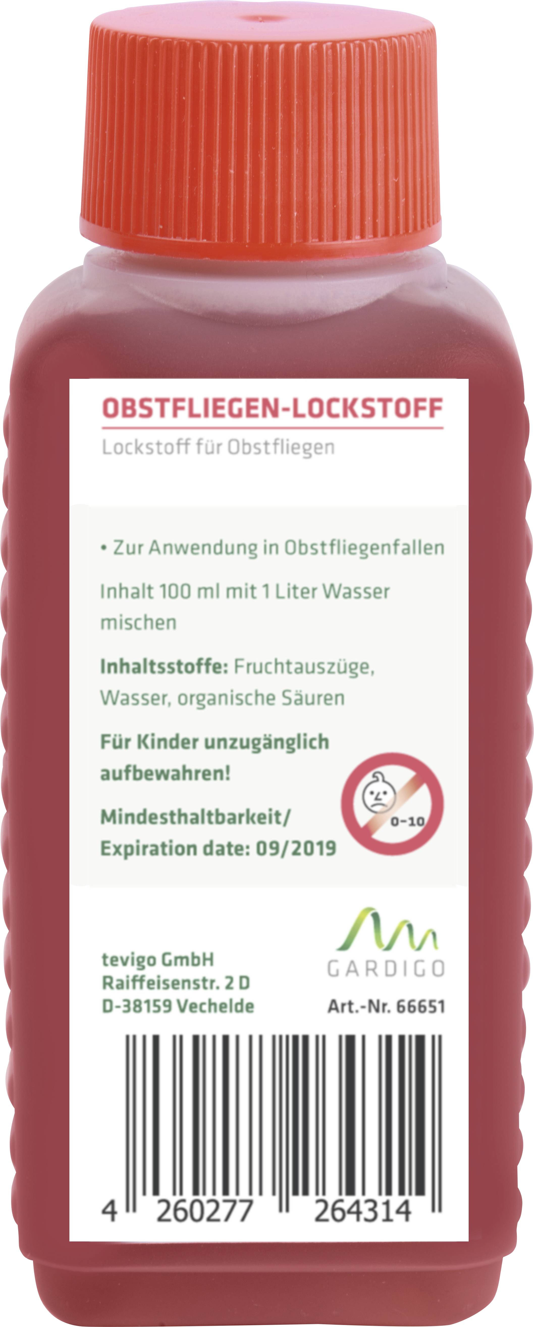 Zum Einsatz in einer Gardigo Obstfliegenfalle zum Anlocken von Obstfliegen. Mischen Sie den Lockstoff mit 1 L Wasser und füllen Sie es in Ihre Falle, um beste Ergebnisse zu erzielen.