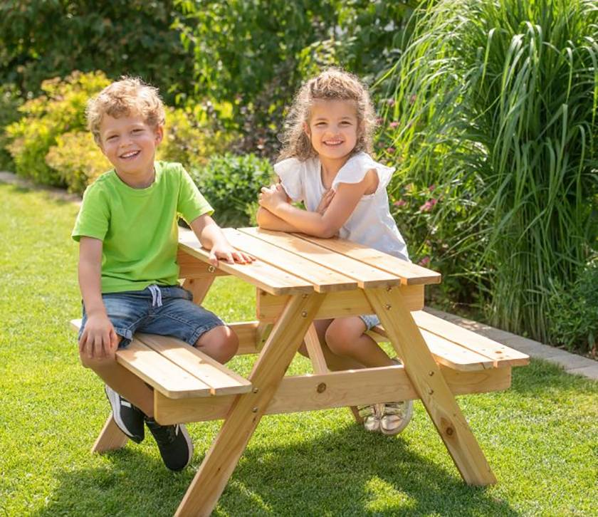 Outdoor active Sitzgarnitur, bestehend aus einem Tisch mit zwei Bänken. Maße aufgebaut ca. 89x78x50 cm. Für Kinder ab 3 Jahren.