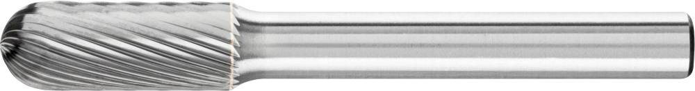 Walzenrundförmiger Frässtift nach DIN 8032 mit Verzahnung nach DIN 8033. Kombination zylindrischer und kugelförmiger Geometrien. GL = Gesamtlänge (Vollhartmetall) SL = Schaftlänge (Stahllangschaft)