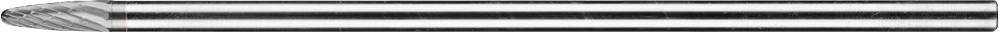 Rundbogenförmiger Frässtift nach DIN 8032 mit Verzahnung nach DIN 8033. GL = Gesamtlänge (Vollhartmetall) SL = Schaftlänge (Stahllangschaft)